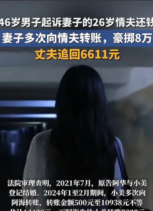 “太炸裂!”辽宁,一40岁已婚女子,在KTV看上26岁小伙,便谎称自己单身,还当场给小伙转账1216块,事后两人发生关系并经常幽会,女子为小伙花了8万多!女子46岁丈夫得知后大怒,要求小伙还钱却遭拒,双方闹到法庭,法院判决令人意外! 根据7月17日潇湘晨报的报道,丈夫发现妻子最近真的很不正常,因为已经40多岁的妻子,不可能每天出去的那么勤快,甚至有时候还经常夜不归宿,或者动不动的就出去旅游,察觉到异样的丈夫,经过自己的调查,竟然从妻子手机里发现了她出轨了! 看着手机内的一些聊天内容,丈夫十分的愤怒,因为自己的妻子竟然瞒着他,在出轨的这些时间内,前前后后总共给这位名叫阿海的男子身上,花费了8万多元! 看着这笔金额,丈夫十分的生气,因为这笔财产是他和妻子的婚内共同财产,妻子根本没有权利私自的给予他人,又遭到了妻子的背叛,丈夫觉得自己经营了这么多年的夫妻生活,算是走到头了! 其实妻子小美早在2024年的时候,在和几个朋友相约下来到了一家KTV,经过朋友的介绍,她的其中一位朋友将年轻的阿海带到了她们的包间,看着年纪轻轻的阿海,小美十分的喜欢,便一直和阿海说话,并且添加了联系方式。 在酒局结束之后,小美主动给阿海转了1216元,让阿海前去将包间当晚的消费给结了,然而阿海知道用不了这么多,然而小美却表示,多余的钱就当做请阿海吃宵夜了! 在接下来的时间内,小美多次的约阿海,不是外出逛街就是约着吃饭和看电影,并且在逛街的过程中,小美不停的给阿海挑选他合适的衣服,只要穿在身上好看的,不论多少钱,小美都直接给阿海支付了衣服的金额! 随着时间的流逝,阿海还是没有抵挡住小美的攻势,因为小美告诉阿海自己单身好久了,自从被上一个男朋友骗过之后,就再也没有谈过恋爱,随即俩人便发生了关系,走在了一起! 但是这件事还是被小美的丈夫所发现,在丈夫得知妻子给阿海花费了这么多钱,直接找到了阿海想让对方将这笔钱给还了,但是阿海却表示,这些钱自己并没有拿在手中,而是外出吃饭,买东西全部和小美一同花费的! 听到对方不愿意归还这笔钱财,丈夫直接将阿海告上了法院,想要让阿海将这笔钱财还给他,然而经过法院的多方面调查,其丈夫提供的转账记录证据,只有14438元,另外阿海也给小美转了7827元,最终法院判决阿海偿还其丈夫6611元! 那么,对于这件事,大家有什么看法? 信源:潇湘晨报