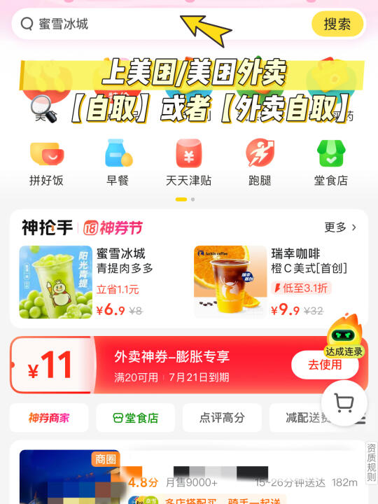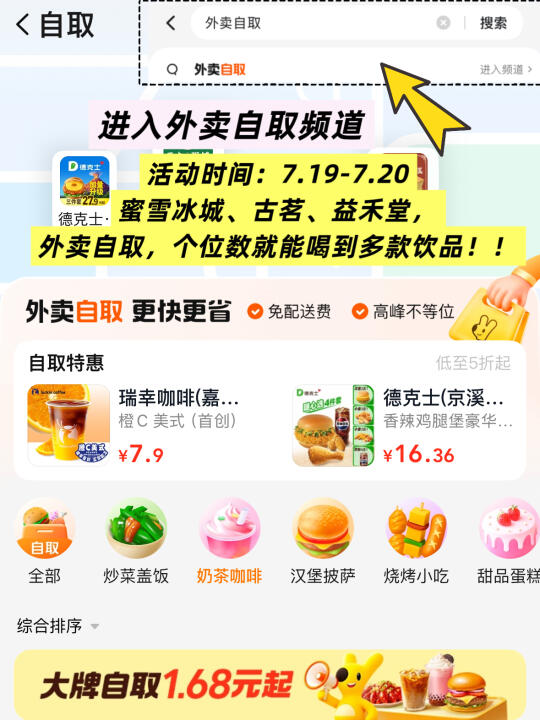 ✔️上美团/美团外卖🔍【自取】【外卖自取】,进入活动页面,如果购买蜜雪冰城的话直接可以从蜜雪冰城页面点击【自取】即可领取到超优惠奶茶!