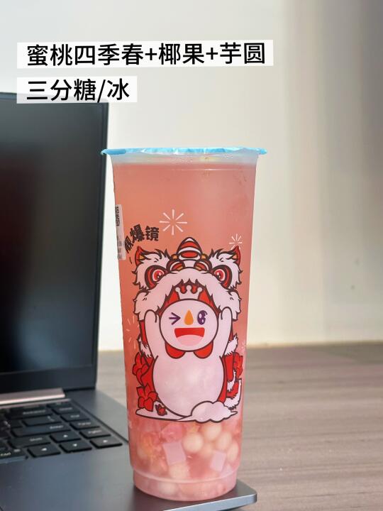 ✅蜜桃四季春+椰果+芋圆 三分糖/冰
