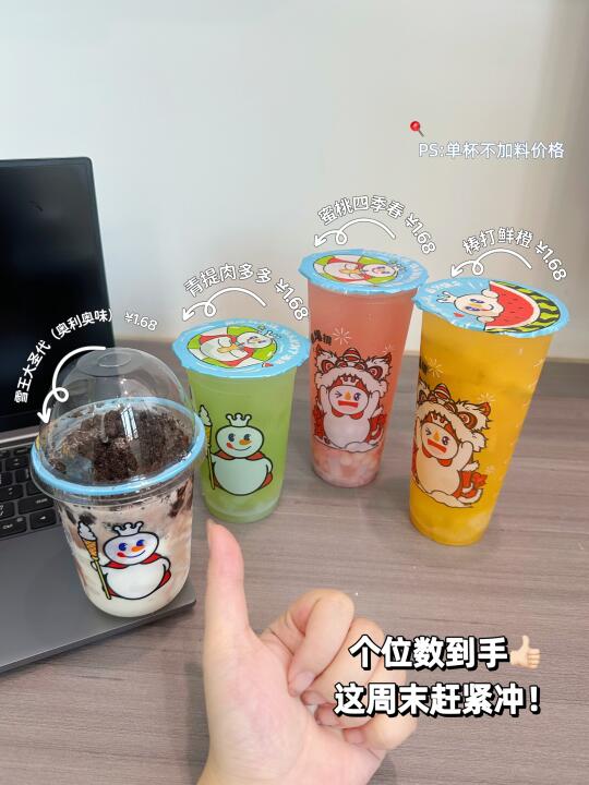 🥤棒打鲜橙/青提肉多多/茉莉奶绿/茉莉绿茶/雪王大圣代(奥利奥味),自取价格仅1.68r🥤新品蜜桃四季春 自取价格仅2.9r等等.......