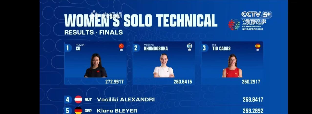 世锦赛首金,创造历史 在花样游泳女子单人技术自选决赛(非奥项目)中 中国选手徐汇妍以预赛第二的成绩进入决赛,决赛中得到272.9917分(难度34.9500分,艺术分112.6000分,执行分160.3917分)