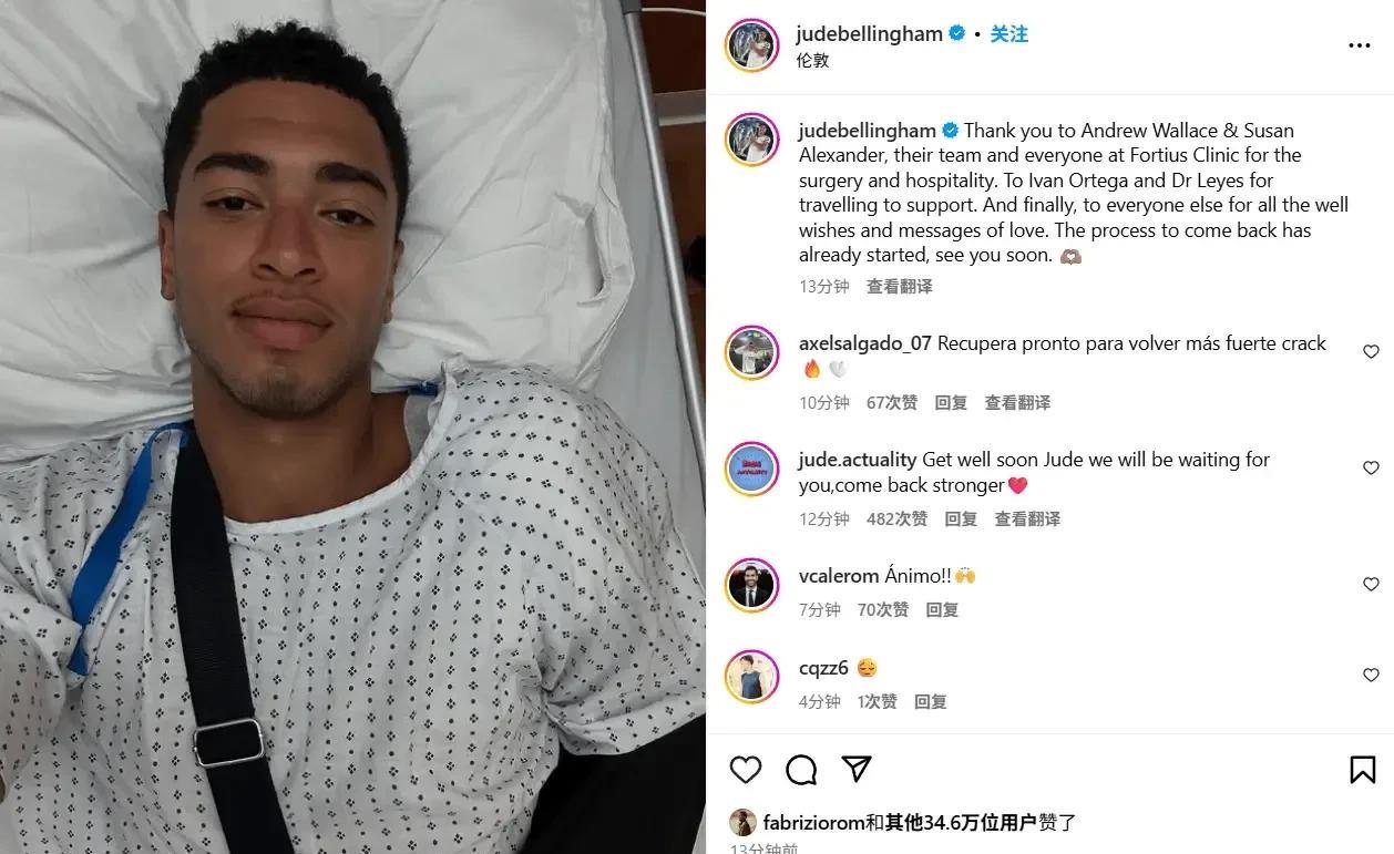 【贝林厄姆更新社媒报平安:肩膀手术顺利,恢复已启动】 皇马中场贝林厄姆今日更新社交媒体,谈及自己的肩膀手术情况。他在文中致谢道:“感谢安德鲁-华莱士和苏珊-亚历山大,他们的团队以及福提斯诊所的每一个人提供的手术和热情款待。感谢伊万-奥尔特加和莱耶斯医生的支持。最后,感谢所有人送来的祝福和爱的消息。我的恢复过程已经开始,很快再见到你们。” 据此前报道,这位英格兰中场将因伤缺席约3个月时间。