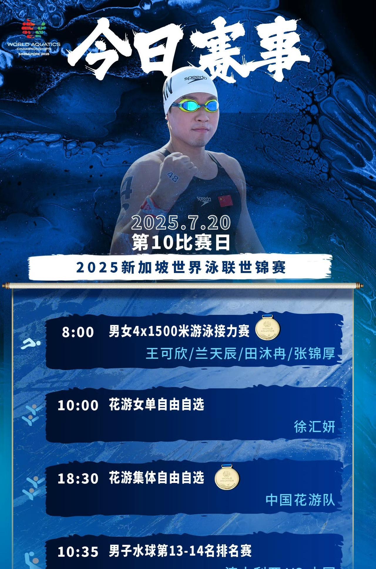 男子组 女子组 而在今天进行的男女4×1500米游泳接力赛中,德国队、意大利队、匈牙利队夺得前三名 同时今日赛程如下,中国继续在花样游泳上向金牌发起冲击。
