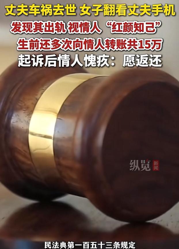 浙江绍兴,丈夫去世后,女子在整理其遗物时,发现其生前出轨,还转给情人15万多元,女子找到对方,要求返还15万元,可对方大言不惭的说,这是女子丈夫自愿赠与,赠与已经完成,拒绝返还。女子一气之下,将对方起诉。最终,经调解,对方愿意返还全额财产。 据纵览新闻,7月19日报道: 近日,浙江绍兴嵊州市社会治理中心调解了一起因婚内出轨引发的赠与合同纠纷案,引发关注。 金丽和丈夫吕凯,曾经也是一对旁人眼中的寻常夫妻。 他们一起走过了许多年头,在柴米油盐中相互扶持,共同为生活拼搏。 虽说日子过得平淡,却处处藏着温馨。 然而,命运却在今年6月的一天,毫无征兆地给了金丽致命一击。 那是个再平常不过的日子,吕凯却不幸遭遇车祸,生命瞬间消逝。 金丽的世界在那一刻崩塌,她陷入了无尽的痛苦深渊,每日以泪洗面,往昔的幸福回忆如今都成了刺痛她内心的针。 料理完丈夫的后事,金丽怀着悲痛与不舍,开始整理吕凯的遗物。 她想留下些丈夫生活过的痕迹,好寄托自己的思念。当她翻开丈夫的手机时,一个足以让她心碎的秘密,就这样毫无防备地展现在眼前。 手机里吕凯和一个叫郑梦的女士的聊天记录暧昧至极,那些亲昵的话语、甜蜜的问候,是金丽在与丈夫多年的婚姻生活中从未见过的。每一个字都像一把利刃,狠狠地刺痛她的心。 而转账记录更是让金丽的愤怒和绝望达到了顶点。 原来,在他们婚姻存续期间,吕凯多次给郑梦转账。 这些钱被用于支付郑梦生活的方方面面,房租费、水电费、美容费等等,前前后后加起来竟高达15万!看着这些记录,金丽满心都是被背叛的痛苦。 这些钱都是她和丈夫辛苦打拼、一分一毫积攒下来的夫妻共同财产,可丈夫却瞒着她,拿去供养别的女人。 金丽怎么也咽不下这口气,心中燃起的怒火让她决定一定要为自己讨回公道。 她想尽各种办法,通过朋友打听、网络查询,终于联系上了郑梦。 面对郑梦,金丽强忍着内心翻涌的愤怒,要求她返还丈夫转给她的15万。 可郑梦却表现得不以为然,理直气壮地回应道:这些钱是吕凯自愿赠与我的,赠与行为已经完成,我没有义务还回去。而且,吕凯生前总是情绪低落,常常找我倾诉,他把我当作红颜知己,我们这才渐渐有了感情。 这番话如同火上浇油,让金丽更加气愤,她怎么也没想到,自己用心经营的家庭,就这样被这个女人轻易破坏了。 无奈之下,金丽只能将希望寄托于法律,她把郑梦诉至当地法院,期望法律能给她一个公正的裁决,确认丈夫的赠与行为无效,让郑梦全额返还财产。 嵊州市社会治理中心的专职调解员钱爱武接手了这起纠纷,开始对双方进行调解。 调解现场,气氛剑拔弩张。 金丽满脸写着委屈和愤怒,她激动地诉说着自己的遭遇:我和吕凯一起生活这么多年,为这个家付出了一切。他却背着我做出这种事,还擅自把我们的共同财产给了别人。 《民法典》第1062条规定:夫妻在婚姻关系存续期间所得的工资、奖金、劳务报酬等,都属于夫妻共同财产 ,夫妻对共同财产有平等的处理权。 他未经我同意,就把钱转给郑梦,严重侵害了我的合法权益,这笔钱必须要拿回来! 而郑梦依旧是那副无所谓的态度,坚持认为钱是吕凯自愿给她的,她不应退还。 钱爱武调解员深知这起纠纷不仅关乎金钱,更关乎道德和法律的底线。 他耐心地向双方讲解法律规定:金丽提到的《民法典》第1062条确实明确了夫妻共同财产的范畴。 吕凯用于赠与郑梦的这15万,来源大概率是他的工资等收入,属于夫妻共同财产。 而且,根据《民法典》第153条规定,违背公序良俗的民事法律行为无效。 吕凯在婚内和郑梦有不正当关系,还把夫妻共同财产赠与郑梦,这种行为既违背了道德准则,也不符合法律规定 。 从法律角度讲,这种赠与行为是无效的,所以,金丽完全有权利要求郑梦返还这笔赠款。 在钱爱武调解员专业且耐心的释法明理下,郑梦的态度终于有了转变。 她的眼神不再那么理直气壮,开始低下头,脸上露出了愧疚的神情。 或许是意识到了自己的错误行为,不仅破坏了别人的家庭,还在法律上站不住脚。最终,郑梦表示愿意返还这15万元。 这场因婚内出轨和财产赠与引发的纠纷,终于落下了帷幕。 这起事件也给大家敲响了警钟,婚姻是受法律保护且神圣的关系,需要夫妻双方共同去守护忠诚和责任。 在生活中,我们都应当珍惜眼前人,遵守道德与法律的底线,用心经营自己的家庭,才能收获真正的幸福,莫要等到失去才追悔莫及。