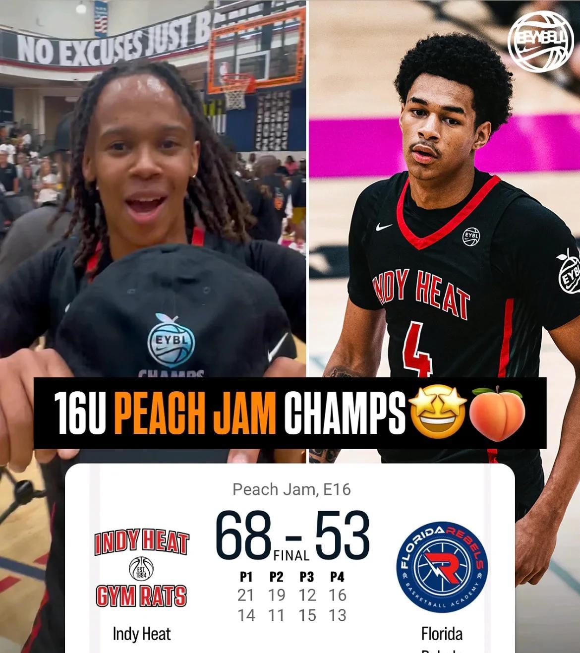 #2027届招生# 五星前锋Kam Mercer得到5分7助攻,0号控卫Jahari Miller单场21分带领印第安纳州Indy Heat在Peach Jam赛事取得八连胜夺得U16级别的冠军。