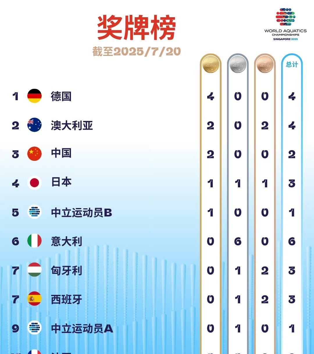 之前技术自选比赛郭牧也获得第四名。 奖牌榜上,德国继续以四枚公开水域的金牌列第一,中国暂列第三。