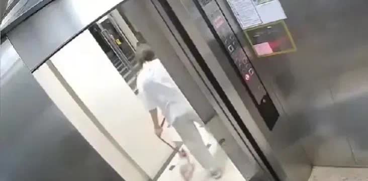 女子牵着狗狗坐电梯,同乘电梯的一名男子吓得靠在电梯角落瑟瑟发抖,嘴里不停的指责女