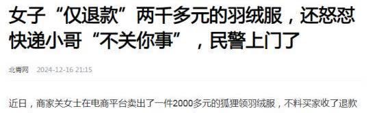 “这次白嫖失败了”河南郑州,女子网购2000 多的羽绒服,申请仅退款后把衣服留下想要白嫖!民警找上门协调,不料,女子理直气壮地说:“我一没偷二没抢,你们凭什么查我的房间!”民警怒怼:“你不要玩这些心眼!” 最近几年,电商平台上的“只退款不退货”功能越来越常见,结果有些买家就想钻空子,拿了退款还不还东西,这简直就是白拿啊。虽然他们没直接偷,但这么做太不讲究诚信了。 到了2024年12月中旬,郑州有个姑娘在网上买了件2000多块钱的羽绒服,东西一到手,她就申请退款,可衣服就是不退回去。店家关女士觉得不对劲,打电话、发信息都没回应,最后只好找快递员看了驿站的监控,才发现衣服被这姑娘拿走了。有了证据,关女士赶紧报了警。警察一来,这姑娘还挺横:“我又没偷又没抢,你们凭什么搜我家?”警察一听这话,直接火了:“你别在这儿耍小聪明!”还告诉她,她这样做算非法占有,要是不把东西的钱还回去,就得吃官司。最后,这姑娘被法律吓住了,只好同意退钱。 事儿是解决了,但这姑娘的做法让大家又开始聊起了爱占小便宜的人和诚信问题。这事儿也给大家提了个醒:规则不是让人钻空子的,想占便宜早晚得吃亏。(来源:北青网 2024年12月16日) 话说在2024年12月16日,北青网上说了这么一件事儿。