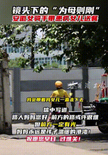七月骄阳,合肥街头热浪灼人,柏油马路蒸腾着暑气。一位博主经过,目光被路边一位停下摩托的女骑手吸引。只见她小心翼翼打开后座的外卖箱——里面,竟蜷坐着一个瘦小的女孩!孩子手上扎着输液针管,胸前隐约鼓起一个包——那正是化疗专用的输液港装置。 这一幕,狠狠击中了博主的心。他悄然靠近,默默在车座上留下一笔现金,还有一张简短的字条:“加油,都会好起来的!”当女骑手送餐归来,发现这份突如其来的善意,眼泪瞬间决堤。她蹲在滚烫的路边,肩头颤抖,无声地擦着泪。 小女孩叫诺兮,年仅4岁,却已与癌症晚期抗争了2年。为了给她治病,家里耗尽了所有,债台高筑。今年4月,这对父母背井离乡来到合肥,双双投身外卖行业,在送餐路上挣取孩子的救命钱。 病中的诺兮格外黏妈妈,一刻不见便会哭闹。无奈之下,妈妈只得在奔波送单时,将她放进那只熟悉的外卖箱里。一块简单的垫子铺在装满汉堡、米饭的箱底,便成了诺兮摇摇晃晃的“移动病床”。酷暑时节,箱内闷热如同蒸笼,小小年纪的她却异常懂事,安静地承受着,很少哭喊。 这段悄悄记录下的视频一经发布,瞬间引爆网络泪腺。新华社迅速转发,无数网友循着踪迹找到诺兮妈妈的账号。那些零散的记录刺痛人心:等红灯的间隙,她慌忙侧身给箱内的女儿喂一口水;或是孩子蜷在箱中沉沉睡去,她拍下照片,留言写着:“宝贝,再坚持坚持……” 评论区内,泪水与善意交织。“诺兮加油!”“心疼妈妈!”的留言飞速滚动。素不相识的人们自发性捐款,五十、一百汇聚成暖流。有人一针见血地评论:“那个外卖箱里,装的哪里是孩子,分明是妈妈全部的念想和希望啊。” 生活的难处各有不同,但这位母亲肩头沉甸甸的担子,让每一滴汗水和泪水都格外灼心。愿无数陌生人的微光能汇成希望,为她和诺兮照亮前路,撑起一丝喘息的空间。更祈愿小诺兮能早日挣脱病魔,离开那闷热的箱体,真真正正地拥抱窗外的阳光,好好看看这个世界的美好。
