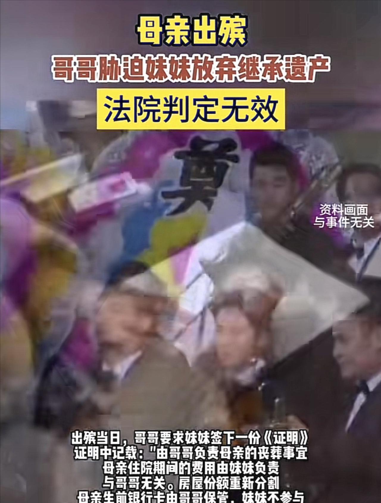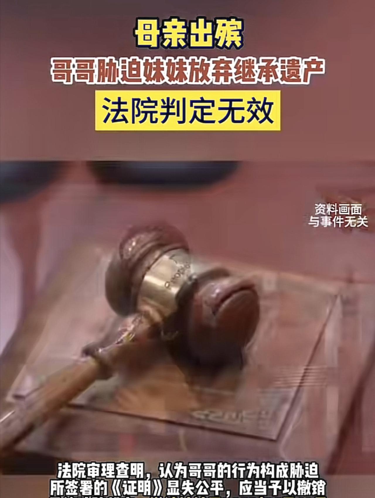 上海,一老妇生前立下遗嘱,将名下房子留给女儿。岂料,老妇去世后出殡当天,其儿子却拦住棺材,要妹妹放弃遗产并签字,如果不签就不能出殡,为让母亲尽快入土为安,只得无奈签字,事后,妹妹将哥哥告上法庭,要求撤销签字的证明,法院这样判! 这是2024年4月的一篇报道。原来,上海的一户人家,女儿李某(化名)从小因为母亲重男轻女,在家中不怎么受母亲的待见。平时无论是吃的用的母亲都十分偏心哥哥,让哥哥先用。在李某的心里一直想让母亲多看看自己,希望母亲可以偶尔偏心一下自己。 于是李某在上学时一直名列前茅,长大之后更是找了一份很体面的工作。反观李某的哥哥从小就十分混蛋,上学时天天逃课打架,早早的辍了学。直到现在也没有稳定的工作靠一直在家啃老。 可就是因为这样李某的母亲更加偏心哥哥,觉得李某现在出息了,以后一定要多多帮助哥哥。李某很不甘心,但又不敢跟母亲叫板。直到母亲突然病倒。李某的哥哥此时却在外地胡混,李某只好给哥哥打电话商量一下母亲的病情和接下来的治疗情况。 可是哥哥以自己在外地赚大钱为由让李某先照看母亲。李某的母亲顿时感到一阵后悔,怎么也想不到自己一直偏心的儿子竟然在得知她生病住院之后竟然漠不关心。反观女儿李某却毫无怨言的在病床前伺候。 李某的母亲在医院治疗了半年之久,李某就在医院细心照料了母亲半年。这半年里,李某的母亲感觉自己以前真是作孽,这么好的女儿不知道好好疼爱。于是李某的母亲将要去世时,立下了一份遗嘱,将自己名下的房子交给李某,随后便离开了。 半年里哥哥一次都没有在医院出现过,直到母亲出殡当天。哥哥突然出现在家里面,当着所有亲戚的面,拦住李某不让母亲出殡。并要求李某交出母亲的遗嘱,签下放弃遗嘱的证明,否则就一直耗着。 李某为了让母亲尽快入土为安,签下了放弃遗嘱的证明。等到李某处理完母亲的身后事之后,就将哥哥告上了法庭。经过法院的调查,哥哥逼迫李某签下放弃遗嘱证明这件事情不符合法律条例,所以不具备法律效力。 最终撤销了李某签署的那份证明,并继承母亲留给李某的房屋产权。网友们知道了这件事,纷纷指责哥哥不配为人。对自己的母亲都可以弃之不顾,简直是社会的败类。 还有许多网友纷纷称赞李某有孝心,小时候母亲偏心也并没有怨恨母亲,反而在母亲生病后悉心照料。还说李某的母亲上辈子一定是干了许多好事才有李某这样子的女儿。 都说“久病床前无孝子”可李某的表现却让很多人都敬佩。试问从小就偏心的母亲和混蛋哥哥,大多数人在长大之后都巴不得离这个家越远越好。可李某却没有丝毫怨言,反而勤勤恳恳的照顾母亲。 对于这件事情你们怎么看?