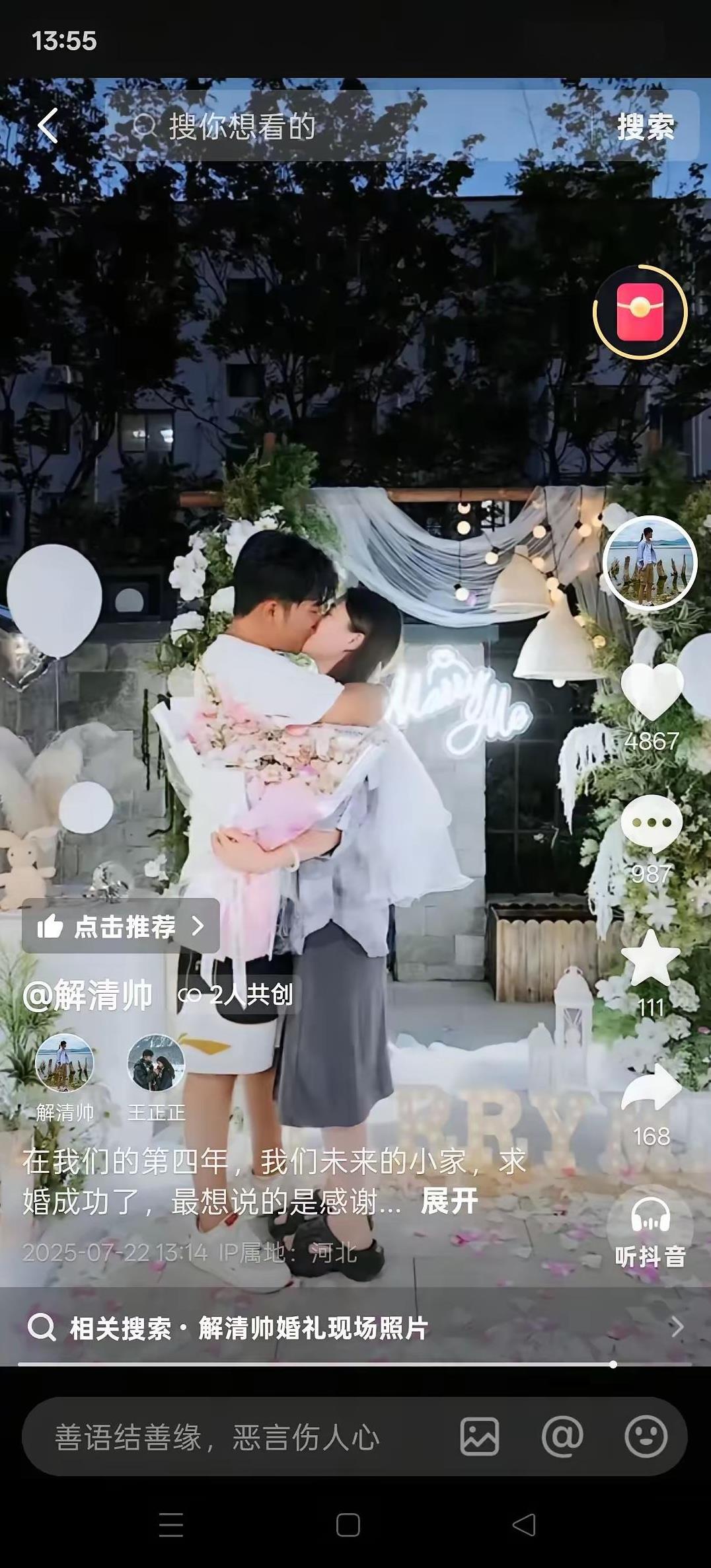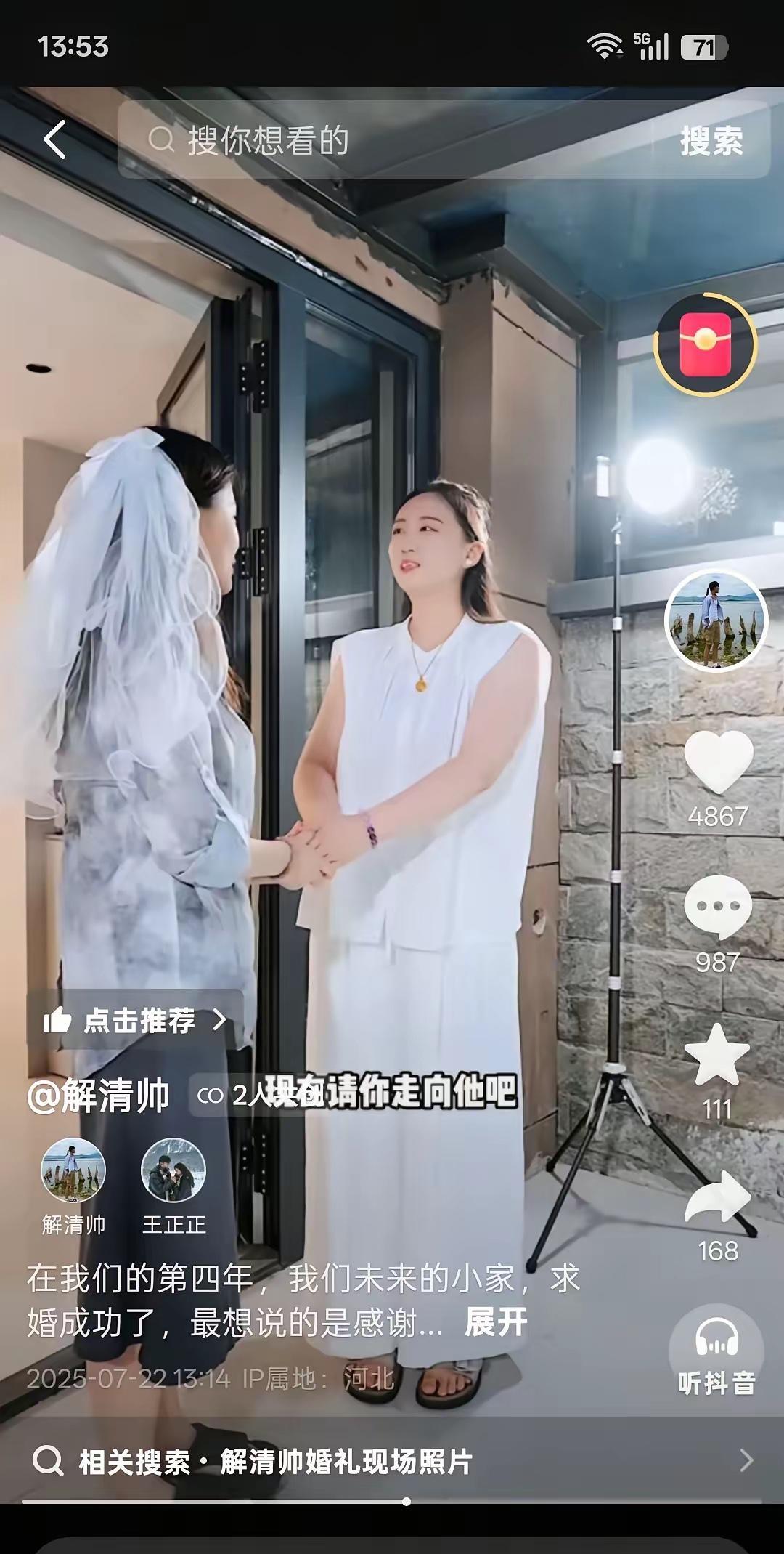 解清帅终于求婚成功了,从校园到婚纱,请来了好多老同学一起见证…… 真的是太有仪式感了,女朋友戴着白色头纱,笑得很甜。 虽然俩人的衣着都不是很正式,但这种比较放松的求婚仪式,也不会有紧张感。 跟着直播间的镜头,粉丝们也感受到了他们生活里的甜。