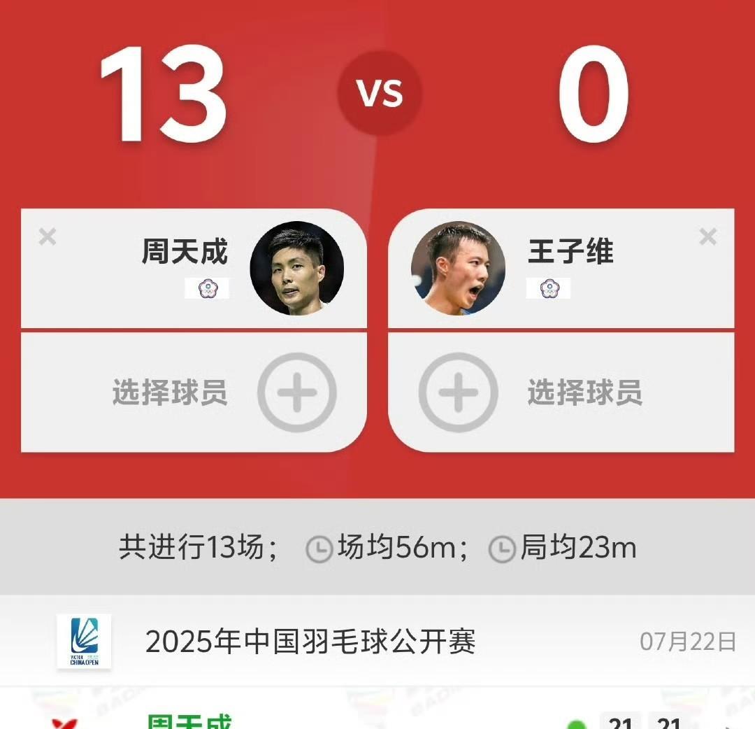 #2025中国羽毛球公开赛# 在常州继续进行。在已经结束的比赛赛果如下: 两人下一轮相遇。 周天成 21-18、21-16 王子维,取得对阵王子维的13连胜。
