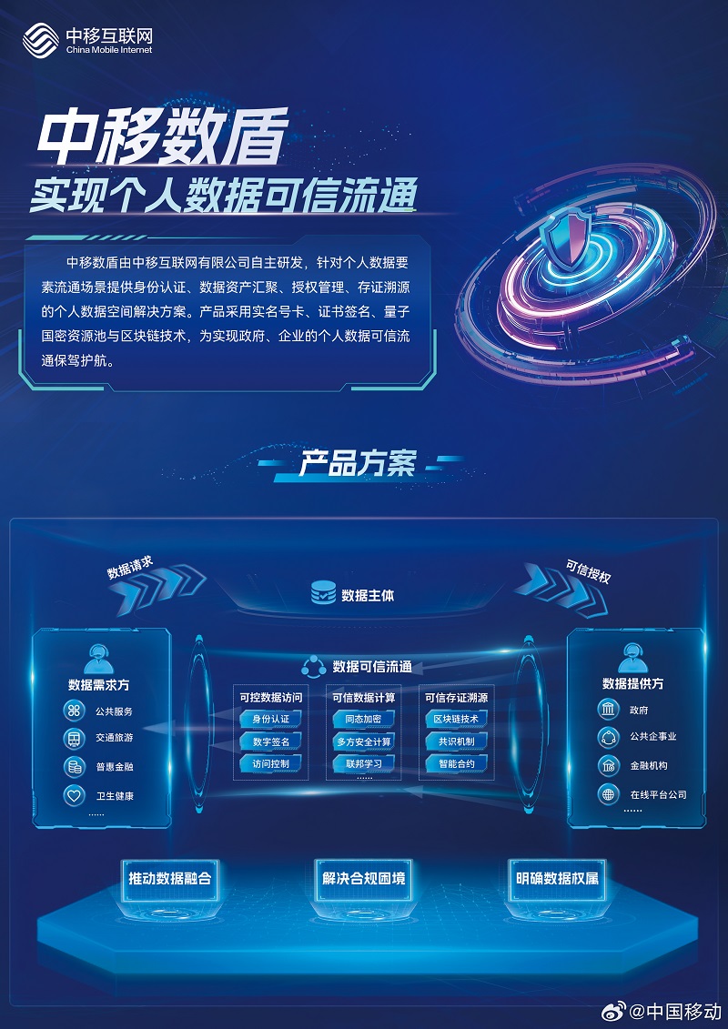 【图解“中移数盾”,围观数据要素可信流通之道】数字经济浪潮席卷全球,如何破解数据流通中的信任困局?@中移互联网有限公司 打造「中移数盾」,针对个人数据要素流通场景提供身份认证、数据资产汇聚、授权管理、存证溯源的个人数据空间解决方案,为数据要素可信流通保驾护航!戳下图,一同探寻数据安全与价值释放的平衡之道!#通信安全一起get#