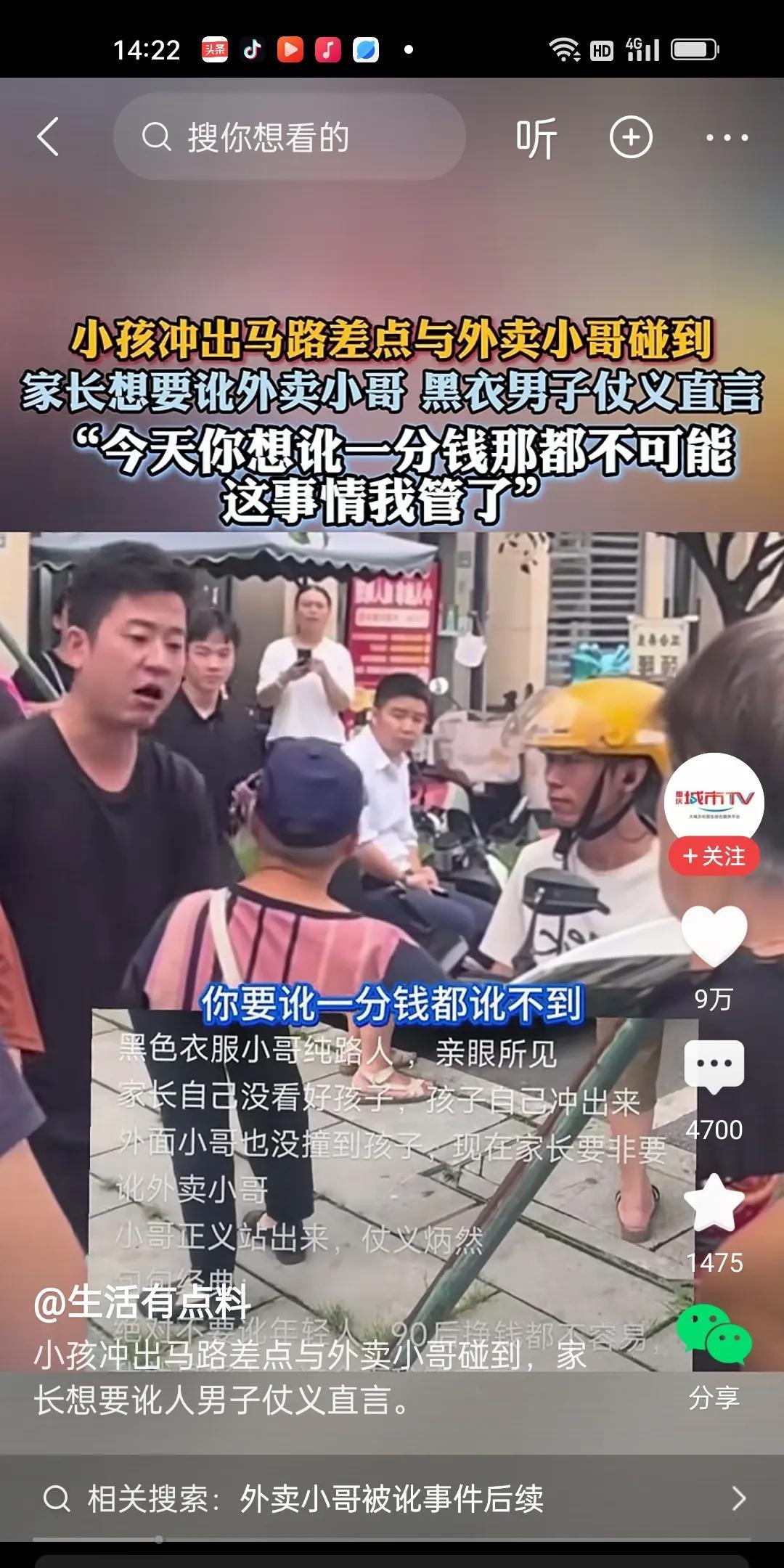 小孩突然冲出马路差点与外卖小哥相撞。家长想要讹外卖小哥,黑衣男子看见了,挺身而出,仗义执言,我全都看到了,现在的年轻人都不容易。今天想要讹一分钱都不可能,这个事情我管了。外卖小哥对黑衣男子的感激之情犹如绵绵江水不绝,都快感动哭了。