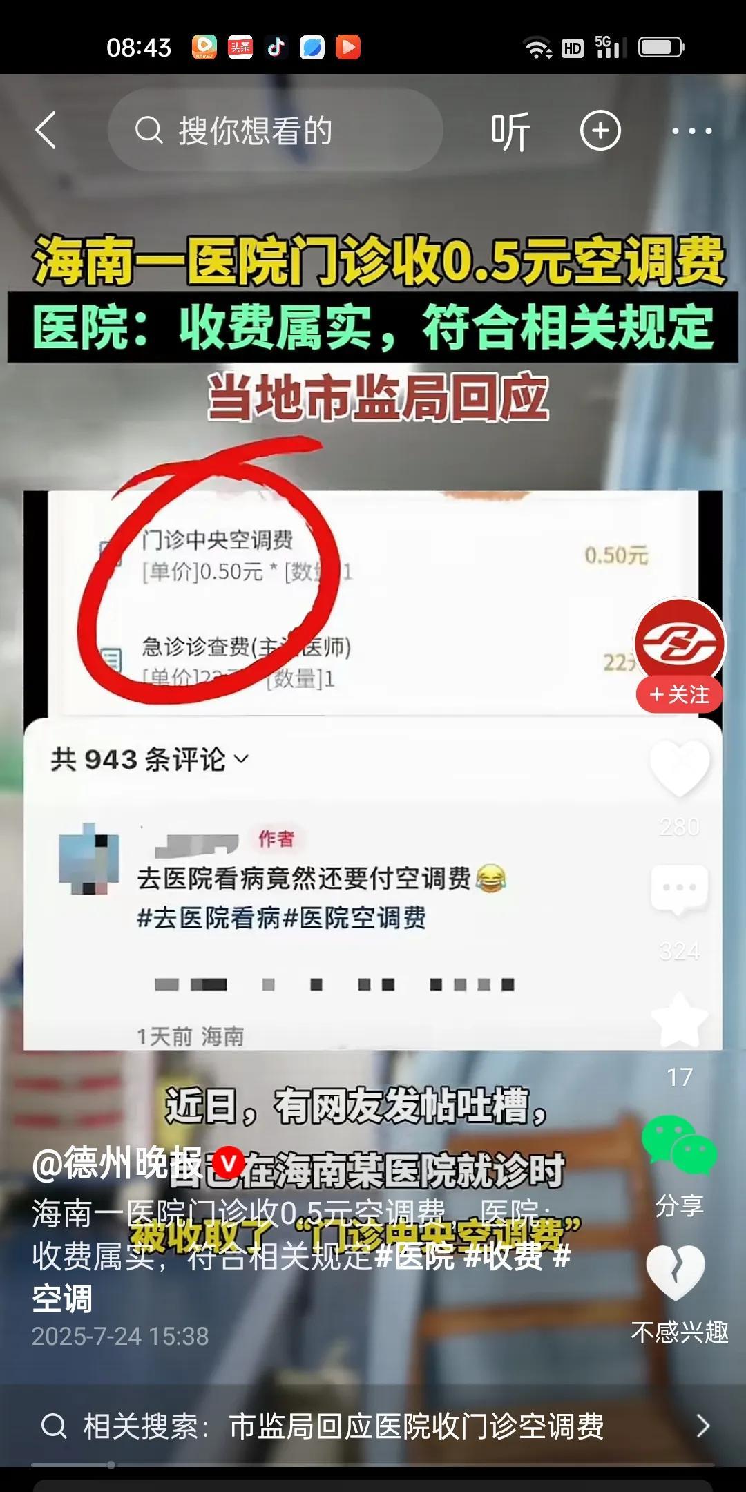 海南一医院居然对门诊病人收取每人次0.5元的空调费,真是让人惊呆下巴。没有门诊患者,你们医院就不开空调了?医生自己不需要吹空调?真的是为了钱无下限。这样的医院真是让人无语。不过有一点挺好,不藏着掖着,明码标价,哈哈。