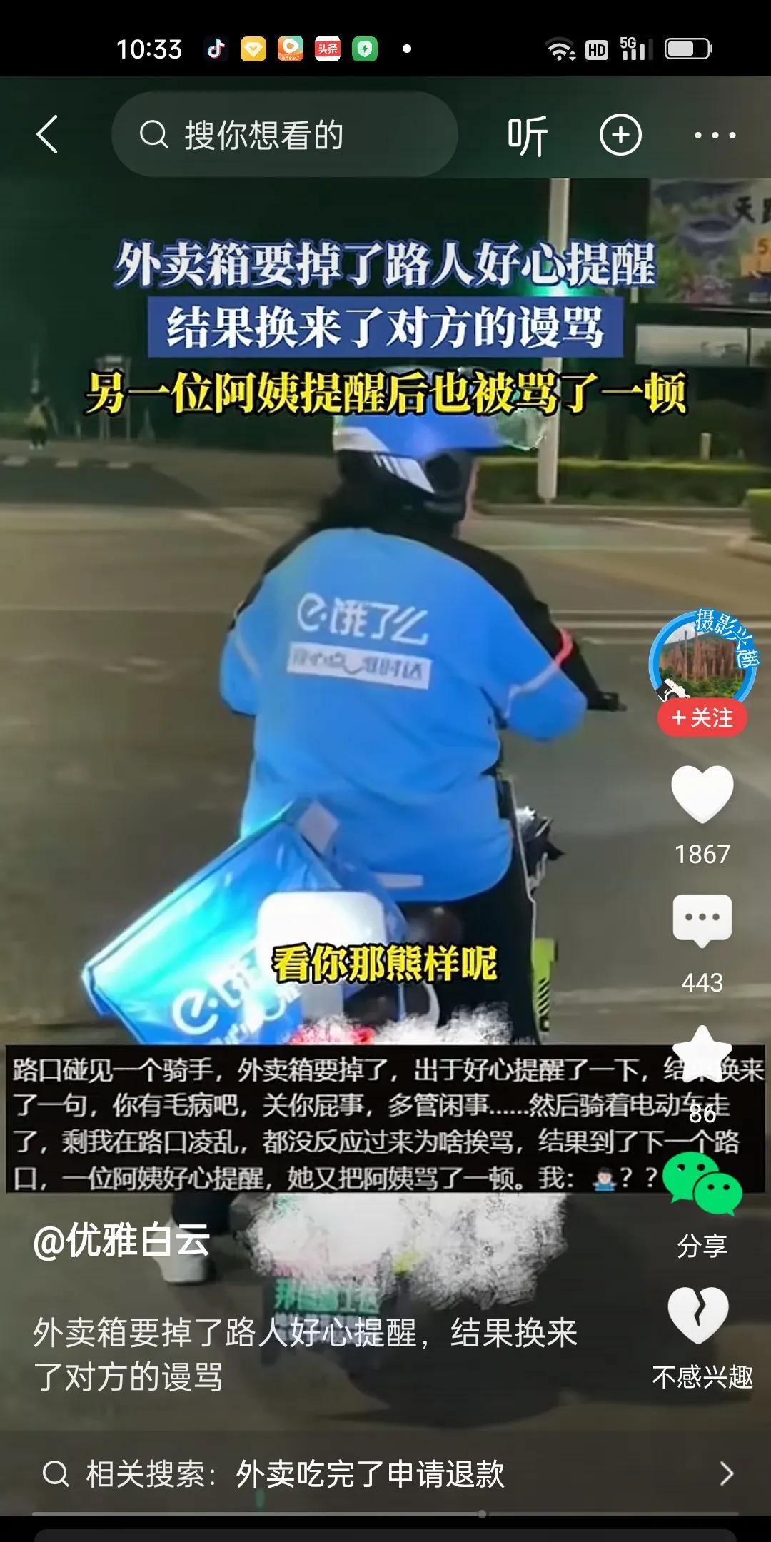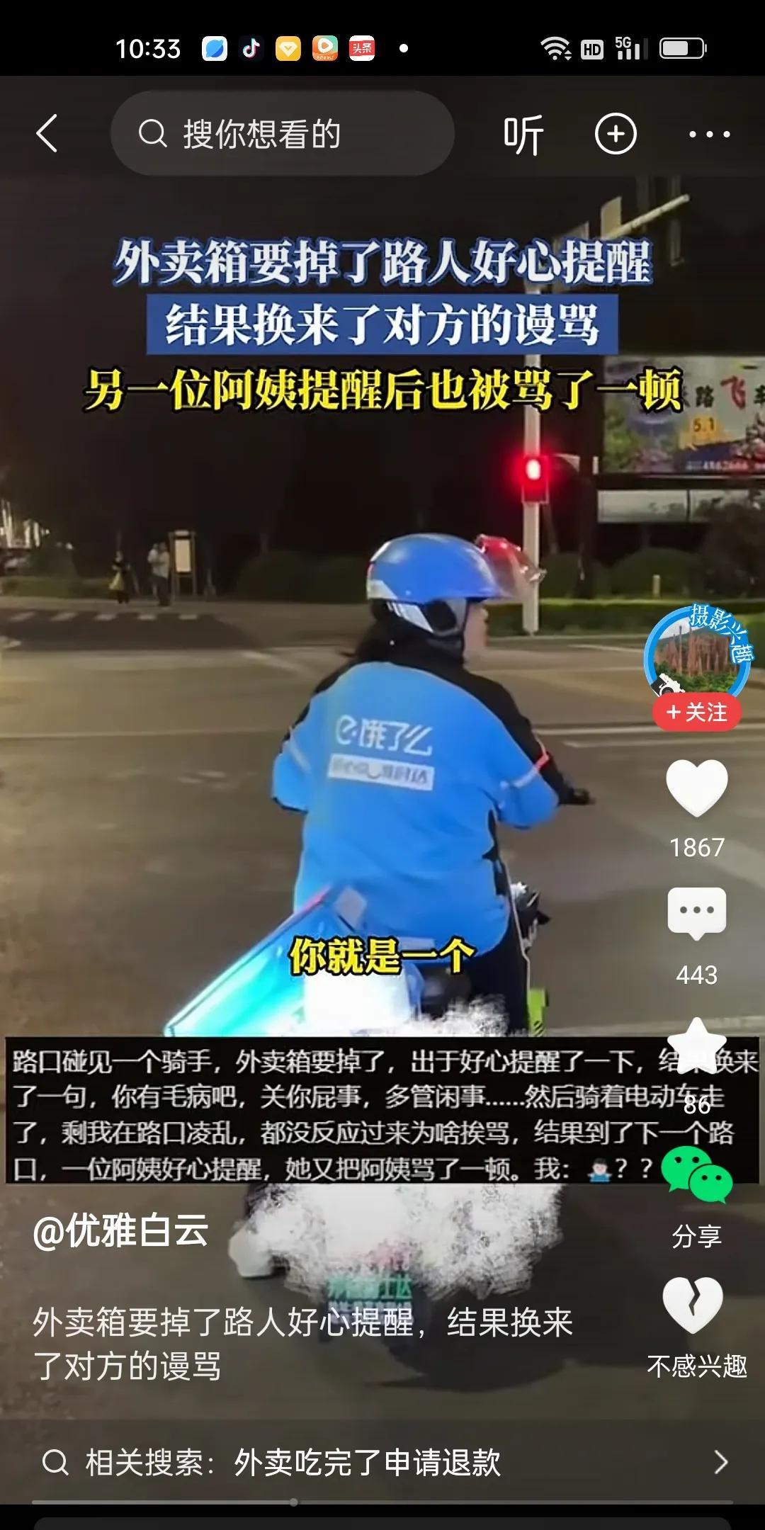 外卖女人的外卖箱要掉了,路人好心提醒她,没想到换来她的痛骂。她骂提醒她的人讨厌,