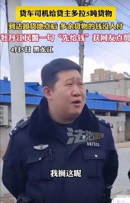 “这个警察火了!”4月6日,黑龙江牡丹江,大车司机给货主多拉5吨货物,不料到达卸货地点后,多余货物的运费没人付,司机只好报警,这时货主又改口说要拍司机证件,然而民警霸气回怼:先给钱,给完钱我让他拍,我搁这呢! 事情发的在4月6日,黑龙江牡丹江。一名大车司机在事发前一天晚上接到了一趟订单,货站表示要将三十吨的货物在第二天中午送往牡丹江。大车司机一听,认为挺近的一个上午可以送到,于是欣然同意。 到了第2天之后,大车司机早早的到了货站等待货物装车,装完之后发现货站多装了5吨的货物。货站声称,到了地方之后货主会补给大车司机在五吨的运费。大车司机想着都是赚钱的都不容易,于是就没有计较,开着车出发前往牡丹江。 等到大车司机将要上高速的时候,发现超重了上不了高速。于是大车司机就绕路从小路开往牡丹江,原本应该是上午就到达的,但是因为绕小路。耽误了时间,所以下午才抵达牡丹江。 到了牡丹江之后大车司机又发现了原本说好的一个卸货的地点变成了三个。于是大车司机就有点生气了,但是自己的这个岗位如今也不是很好干,就忍了下来。 谁知道卸完货之后货主拖着就不想给钱,就这样拖了一个晚上,大车司机的车就停在那个卸货区。到了第二天之后,大车司机发现自己要缴纳100元的停车费。并且在大车司机问货主要钱的时候,货主不愿给大车司机多出来那五吨的运费,还以大车司机未按照约定时间将货物送达,想要少支付运费。 大车司机忍无可忍,就打电话报了警。等到警察过来之后,货主表示,要拍大车司机的证件。警察在了解了情况之后,大声说:“先将钱给人家,给完钱之后我让他拍,我搁这儿呢!”一句话将货主怼的哑口无言,只好乖乖把运费一分不少的给了大车司机。 在警方了解事情经过的时候,大车司机就拿出来手机在拍视频,警察看到之后对着大车司机说:“可以录视频,但是不能掐头去尾,断章取义,如果掐头去尾,断章取义会追究你法律责任。” 这个视频被大车司机发到网上之后,网友们纷纷给这名警察点赞。表示警察很有担当,处理事情十分公平公正,而且能看到事情的根本,将这件事很高效的就解决了。 也有网友们很同情大车司机,表示大车司机很不容易,每天都在外面跑车拉货。吃睡都在车上,每次拉货跑长途都很提心吊胆的。纷纷祝愿大车司机每次跑车都一路顺风。 人民警察是很值得我们尊敬和崇拜的。危急时刻冲锋在前,社会安定的时候把百姓装在心间,默默的守护一方安定,他们心里面的责任与担当令人动容。 对于这件事情,你们怎么看?