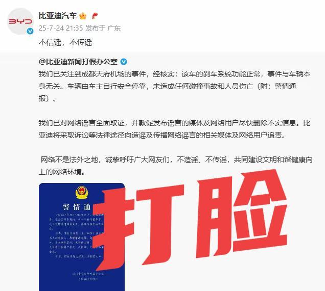 打脸来得太快!果然还是黑比亚迪有流量… 成都机场附近一辆“不断绕圈”的比亚迪汉,既牵调动了万千网民的“吃瓜心”,也撕开了人性的“丑恶”… 视频中,车辆的每个弯道都有明显的减速和制动亮灯,但别有用心的人就是以“车辆失控”博眼球、个别媒体推波助澜,不等帽子叔叔正式官宣、顶着吃官司的风险也要赚这点“黑心”流量… 现在好了,官方辟谣了、比亚迪法务部追究了,也该消停了…[奸笑]