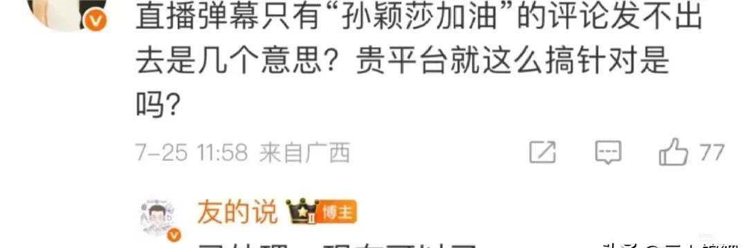 孙颖莎真是硬骨头。平日低调没比赛就没消息,结果无良媒体纵容黑粉谩骂攻击她,还禁止说“孙颖莎加油”,因为没交保护费啊。太荒唐了! 图1 某咕工作人员承认,把“孙颖莎加油”设置成违禁词,不能发出。 “孙颖莎加油”是什么倒反天罡的词汇吗? 就因为她背后没签团队,硬骨头不肯屈服没交保护费,所以对抗不过暗处的资本黑手? 【二】 既然不待见她,为什么赛前还以她为噱头宣传?三个人的名字,把她排前,只放她的图片。(图2) 不就是知道 【大家奔着她来的,老百姓就爱看她,平台衣食父母就爱看她吗?】 图3:2024孙颖莎全平台涨粉两千多万 周总理当年曾说: “人民群众喜欢,你不喜欢,你算老几?” 好,就当你是老几,那就完全屏蔽孙颖莎所有信息啊,别玩“端起碗吃饭,放下碗骂娘”这套啊。 前脚刚靠她吸流量,后脚就背刺限制,是收了要黑她限制她的钱、不得已而为之了吧? “利”字当头,没有是非观“有奶就是娘”的两面派罢了。 须知,老百姓爱看什么,有自己的判断,你黑不了! 球迷呼吁:多平台转播赛事,别让一家独大,别再纵容这种恶意抹黑国家运动员的现象。