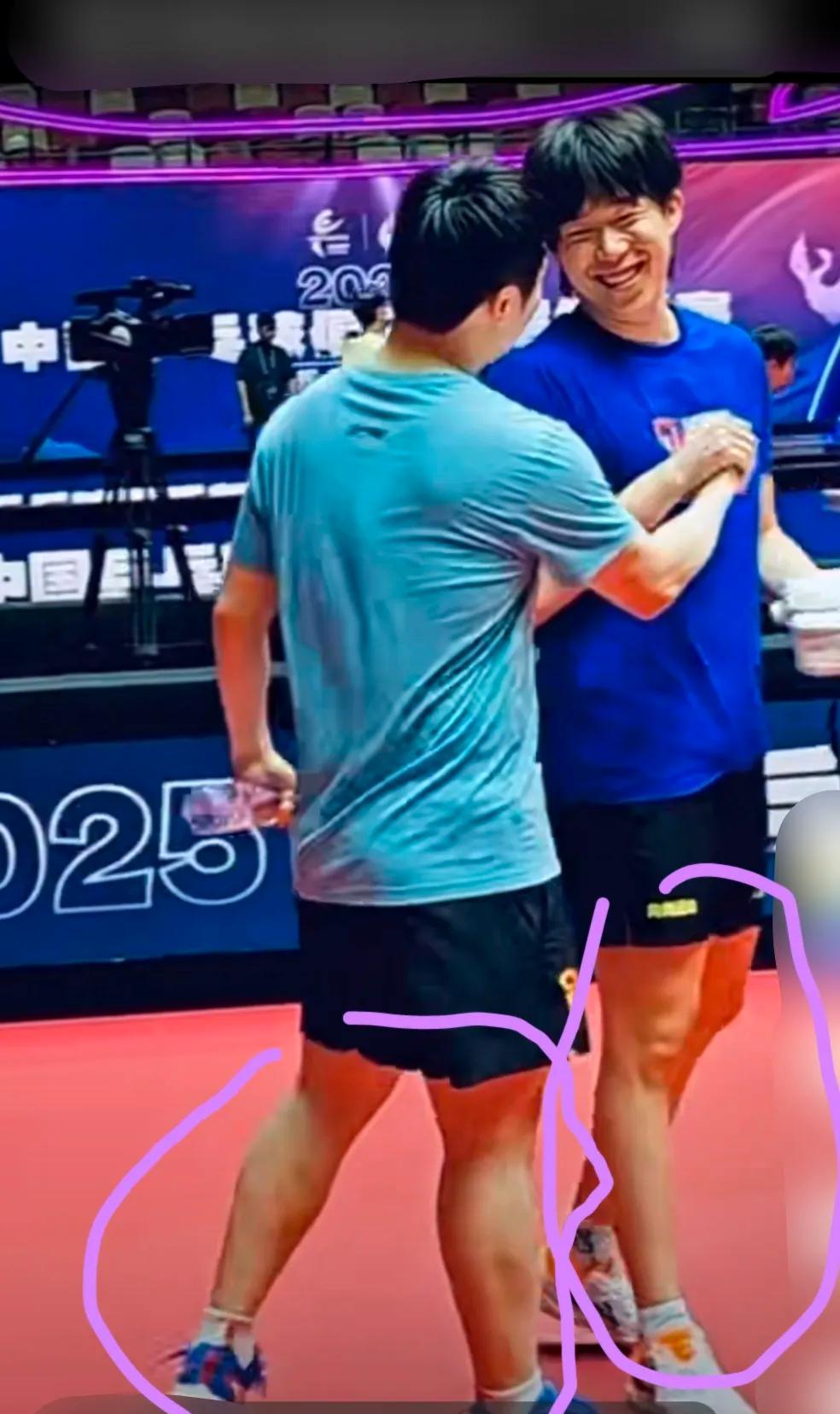 累到腿抖,瘦到见骨 这一幕把全场看哭 乒超厦门站第一天,樊振东刚练完,汗顺着下巴砸地板。王楚钦迎面走来,腿细得像筷子,两人对视一秒,啪地击掌,没一句废话。 镜头扫过,樊振东的护腰勒得发红,王楚钦的护踝厚得离谱。观众席安静得只剩心跳,没人敢喊加油,怕一开口就破防。 他们拼的不是冠军,是把每一次上场都当成最后一次。 看见没,真正的热爱,连疲惫都发光。