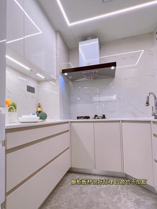 空间收纳做的杠杠的,衣柜做了挂衣区,放衣区,还留了两个区域用来放厚衣服。厨房更是心机满满,吊柜里藏着下拉篮,碗碟锅具都能轻松收纳,台面清清爽爽。柜门关合几乎没有声音;隐形拉手,完全不影响整体简洁感。板材真的没什么味道,安全性满满!