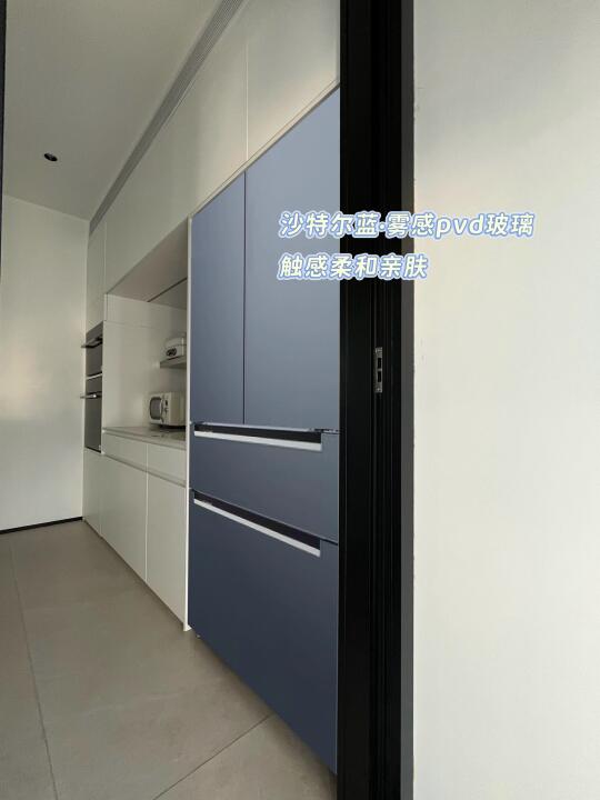 高级感拉满的沙特尔蓝玻璃面板,配上会呼吸的灯效把手,摸起来温润舒服,直接成了我家厨房C位担当!