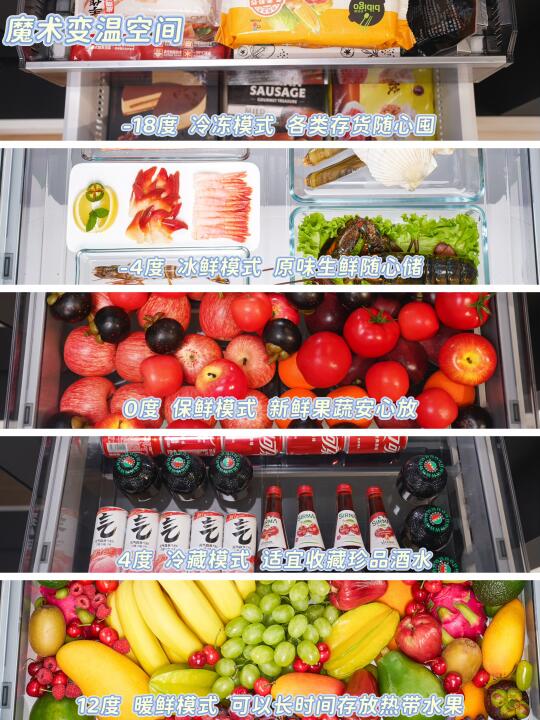 魔术🪄变温空间yyds!一个抽屉,五种存储温度随心变!妈妈包的饺子(-18℃冷冻)、队友买的小龙虾🦞(-4℃冰鲜)、宝宝吃的果蔬🥦(0℃保鲜)、爸爸的酒水(4℃冷藏)以及我喜欢的香蕉🍌(12℃暖鲜)都可以安心存储。全家需求,一“屉”搞定!