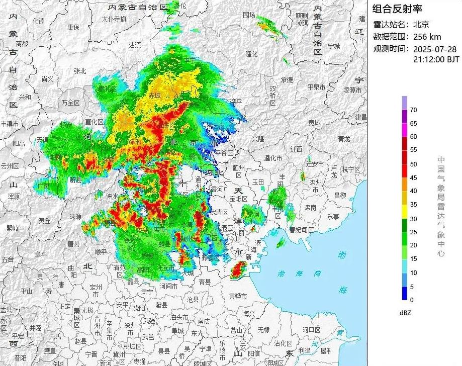 北京出现暴雨到大暴雨,降雨仍在持续 昨天中午北京气象台就升级发布暴雨红色预警,预警时间是7月28日20时到29日7时,预警内容是大部分地区6小时降雨量150毫米。昨晚20时许强降雨云团就进入了北京境内,到了今早7时,强降雨仍在影响但有所减弱,因此降级发布暴雨黄色预警。 根据北京台发布的监测,昨晚19时到今早7时,北京多地出现暴雨到大暴雨,最大降雨量出现在西南部,为184.2毫米。北部地区降雨较预期弱,但前两天北部部分地区累计降雨量超过300毫米,即使是中到大雨也是不容小觑。 今天上午强降雨将自西向东趋于结束。