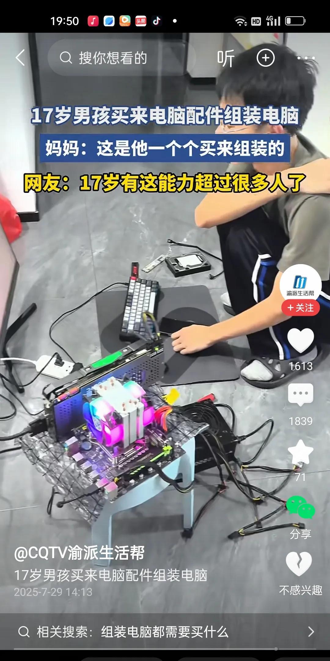 家长在网上夸自己17岁的儿子太厉害了。因为儿子买了一堆堆零器件组装了一台电脑。对