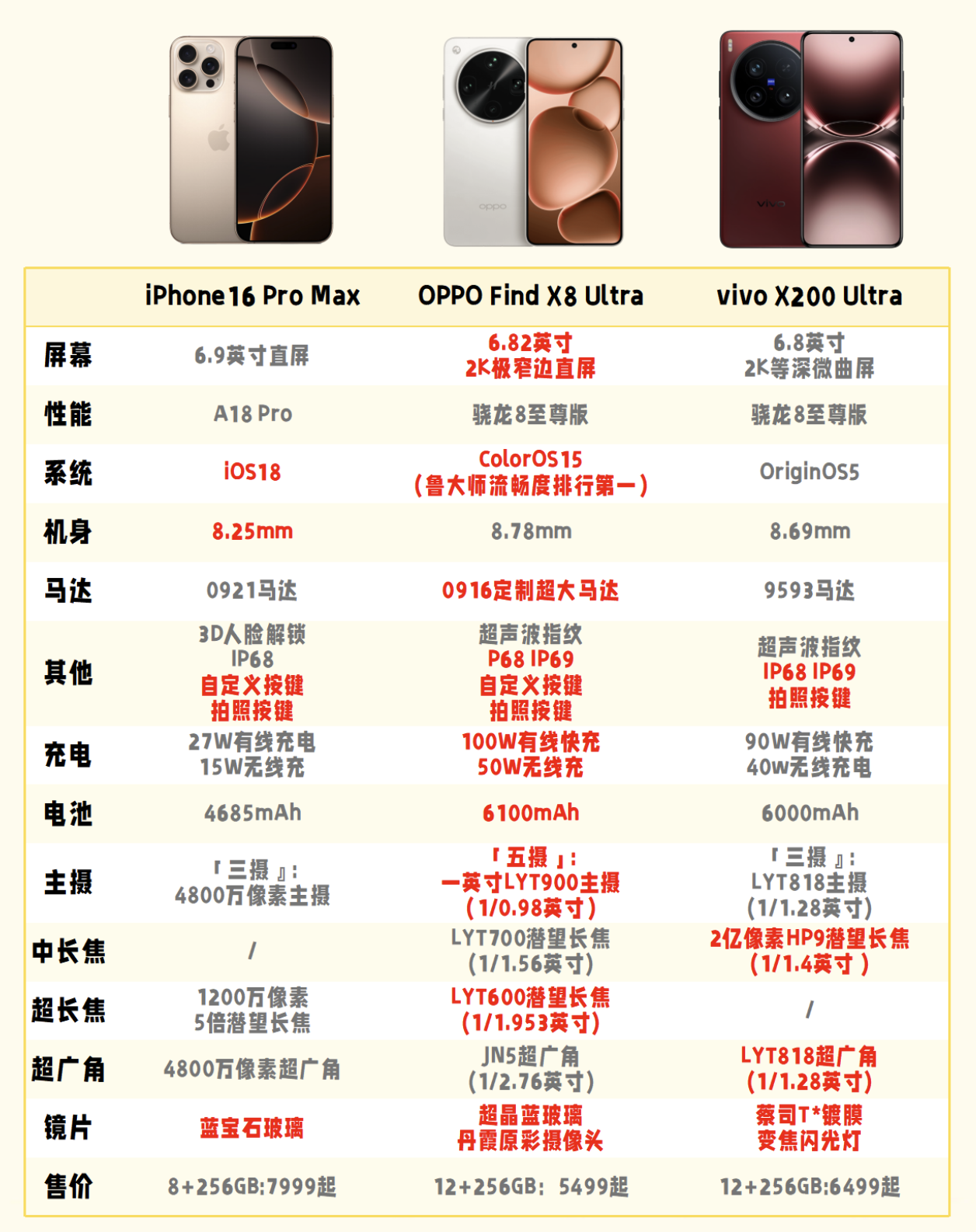 iPhone 16 Pro Max、OPPO Find X8 Ultra和vivo X200 Ultra三机参数对比