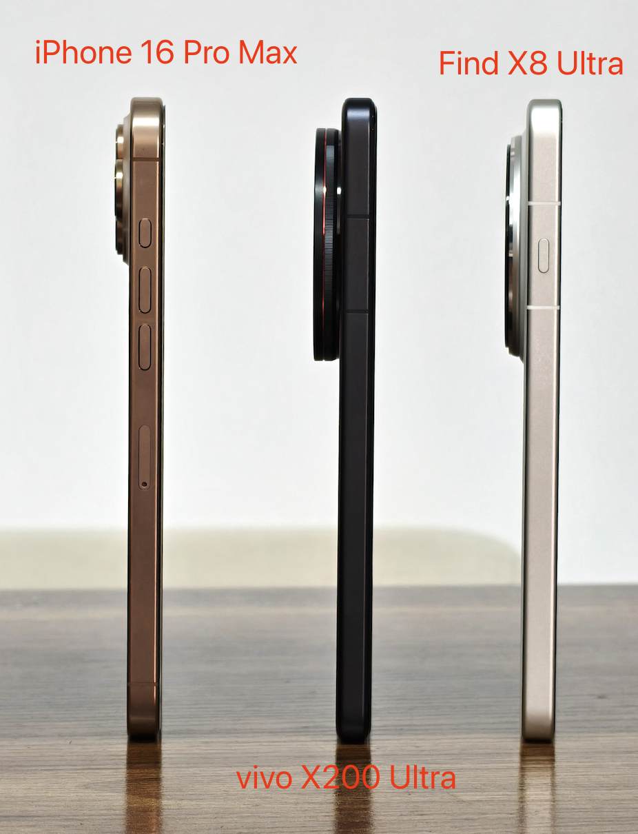 iPhone 16 Pro Max、OPPO Find X8 Ultra和vivo X200 Ultra三机侧面对比