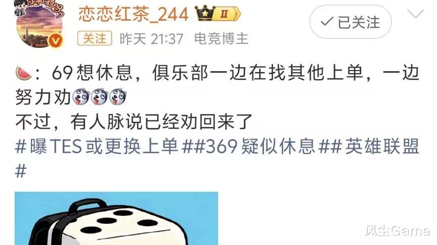 爆料博主恋恋红茶,发文透露:369想休息,俱乐部一边找其他上单,一边劝369,怎么这个剧情,好像在哪里见过呢?Bin大哥第一赛段的时候,也是被爆背书包出走,老9连这都要学啊?OBGG上,滔搏二队上单Zuian,已经在大名单里了,目前还不知道,揭幕战是369上还是新人上。