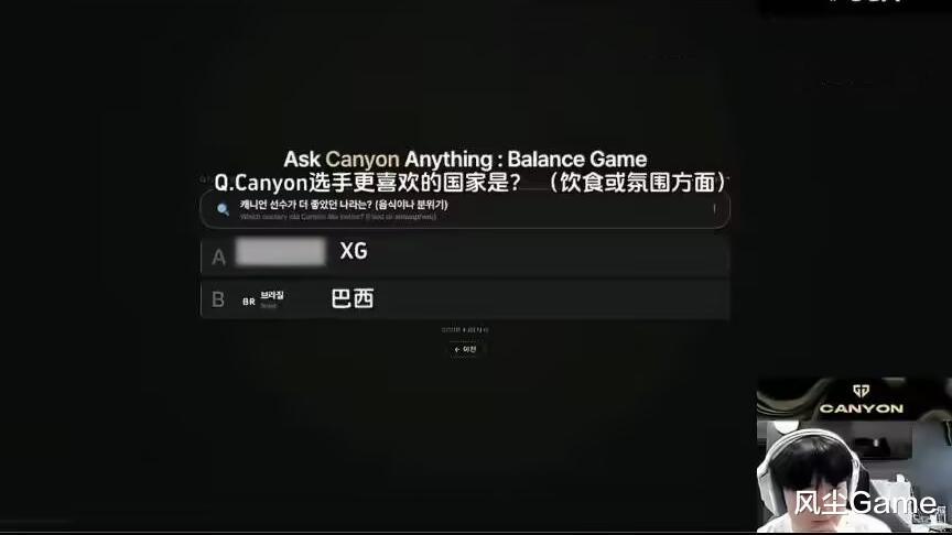 GEN战队下路Ruler选手,最近因为漏税备受关注,尺帝的事情,还没告一段落,GEN的打野选手三叔,又闹出了幺蛾子,GEN在SOOP频道里,邀请粉丝们,在评论区留下A或B的平衡性游戏问题,选手们直播的时候对问题回应,三叔的其中一个问题是:Canyon选手,更喜欢的国家是?