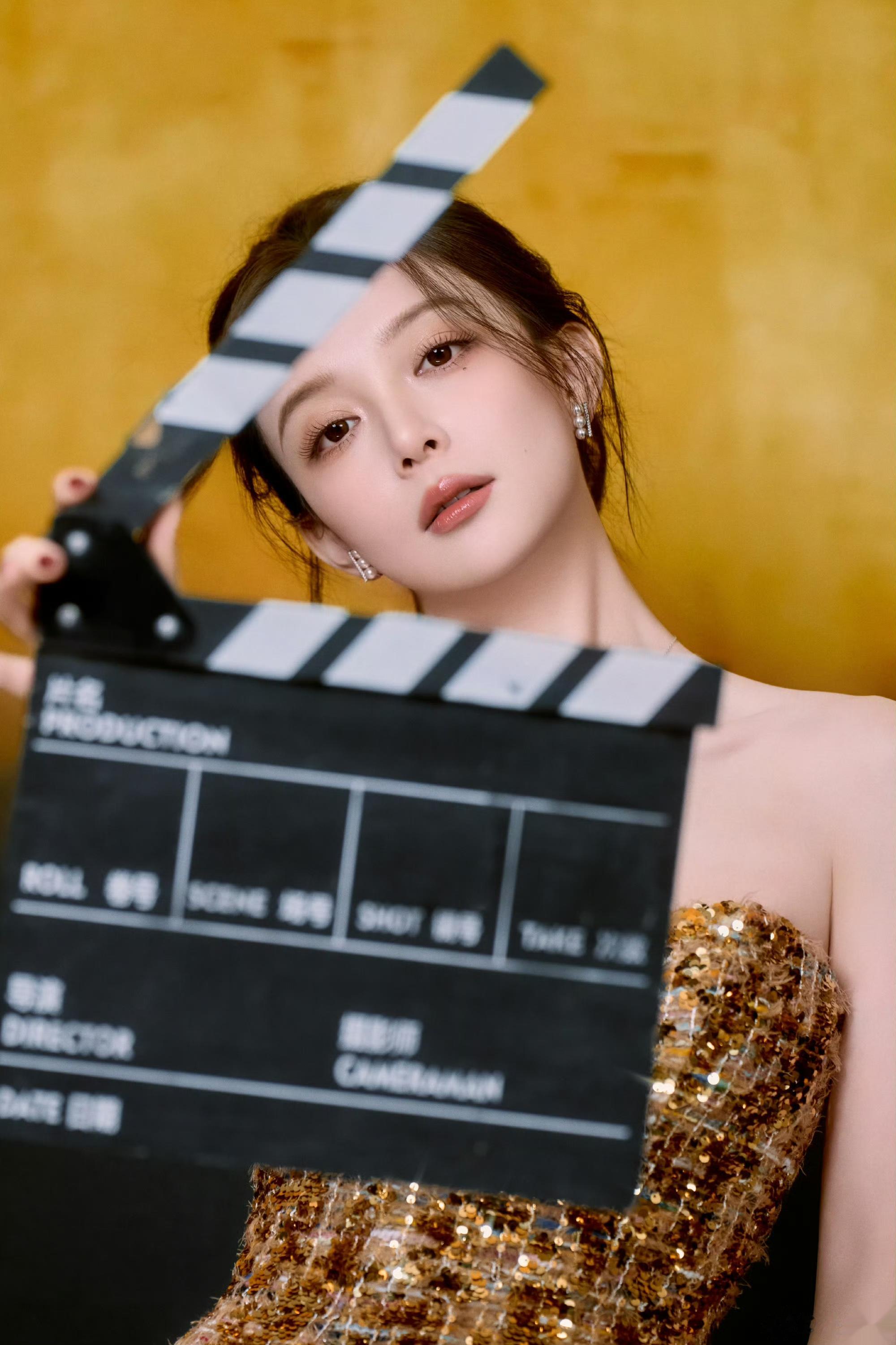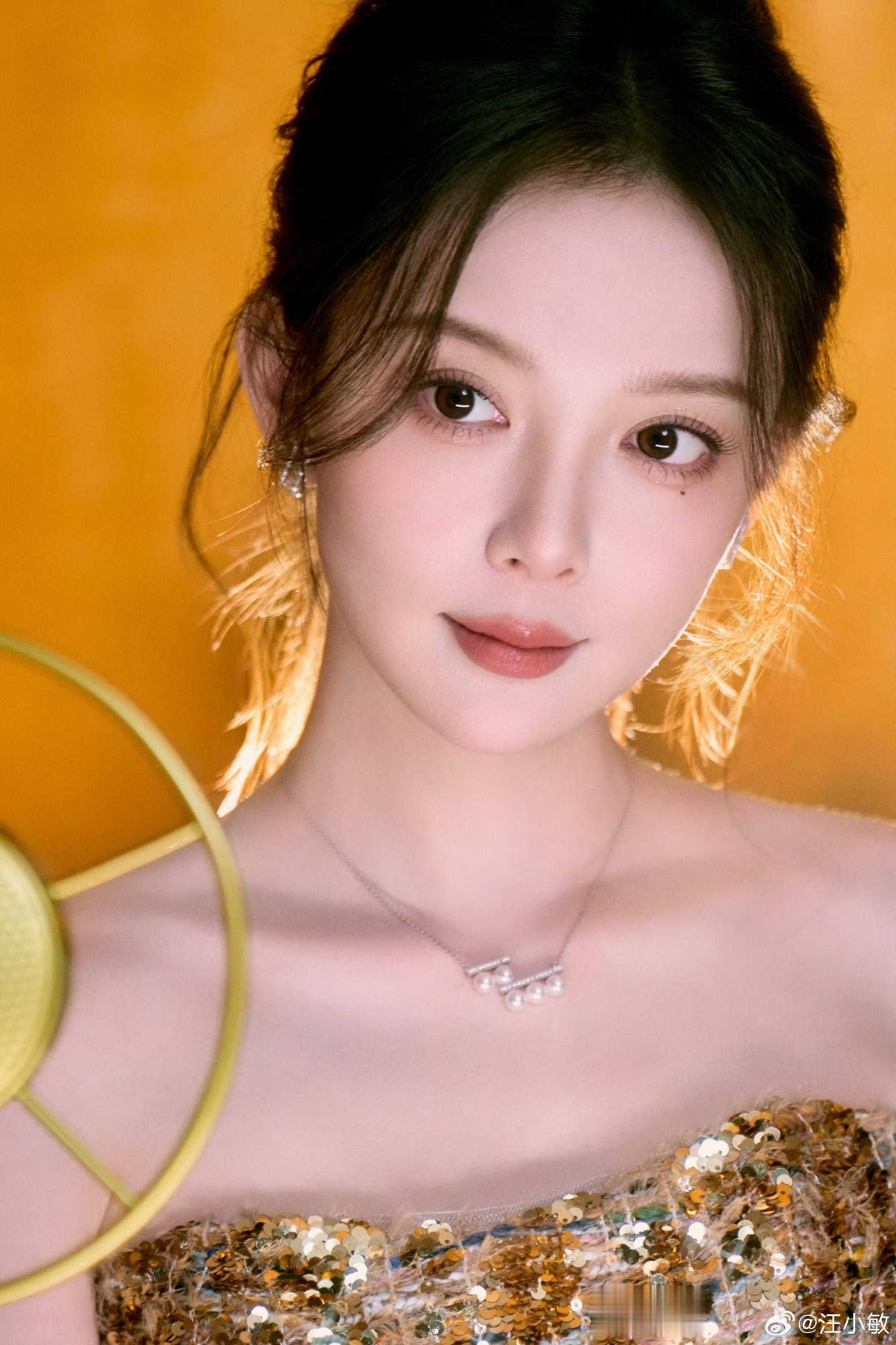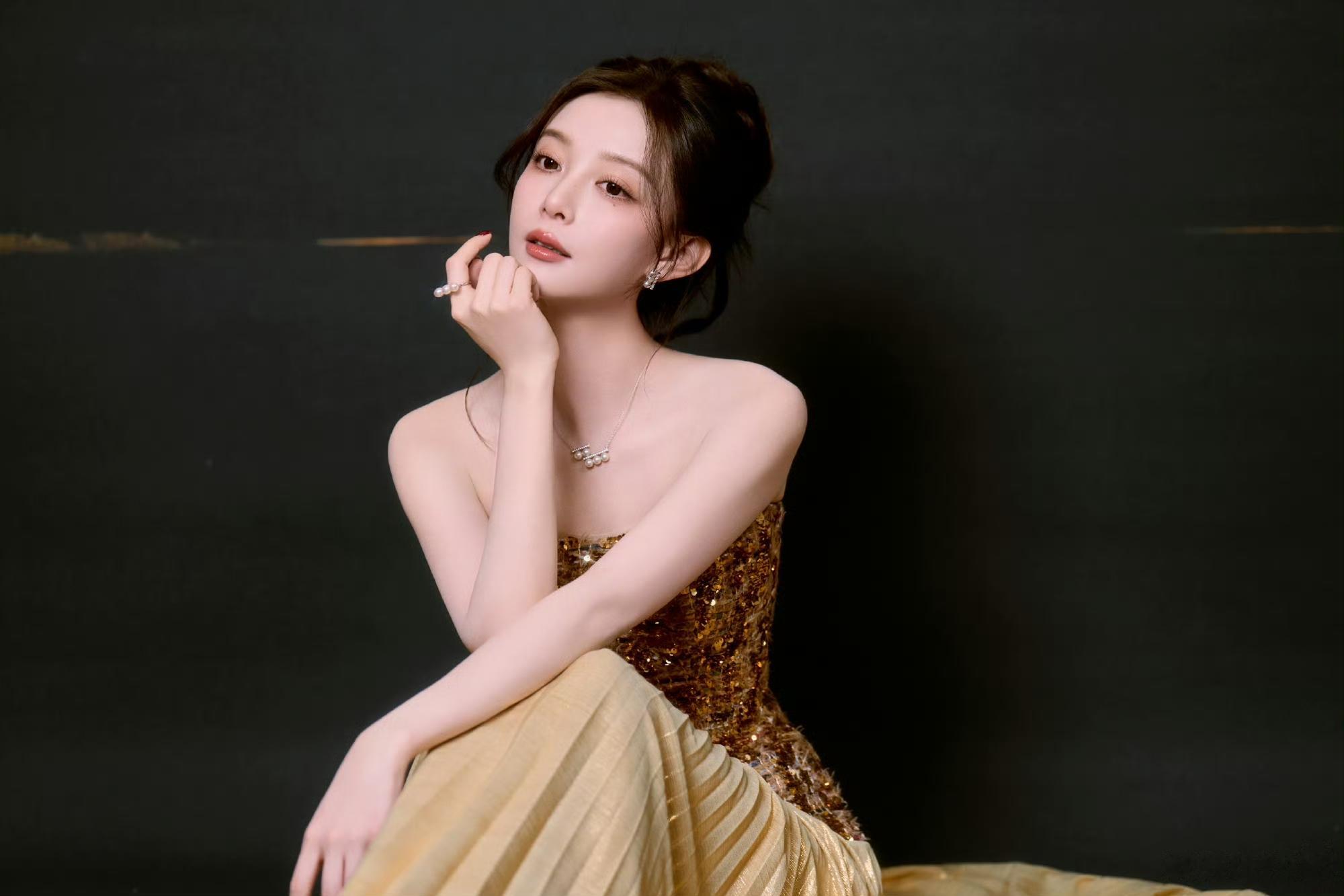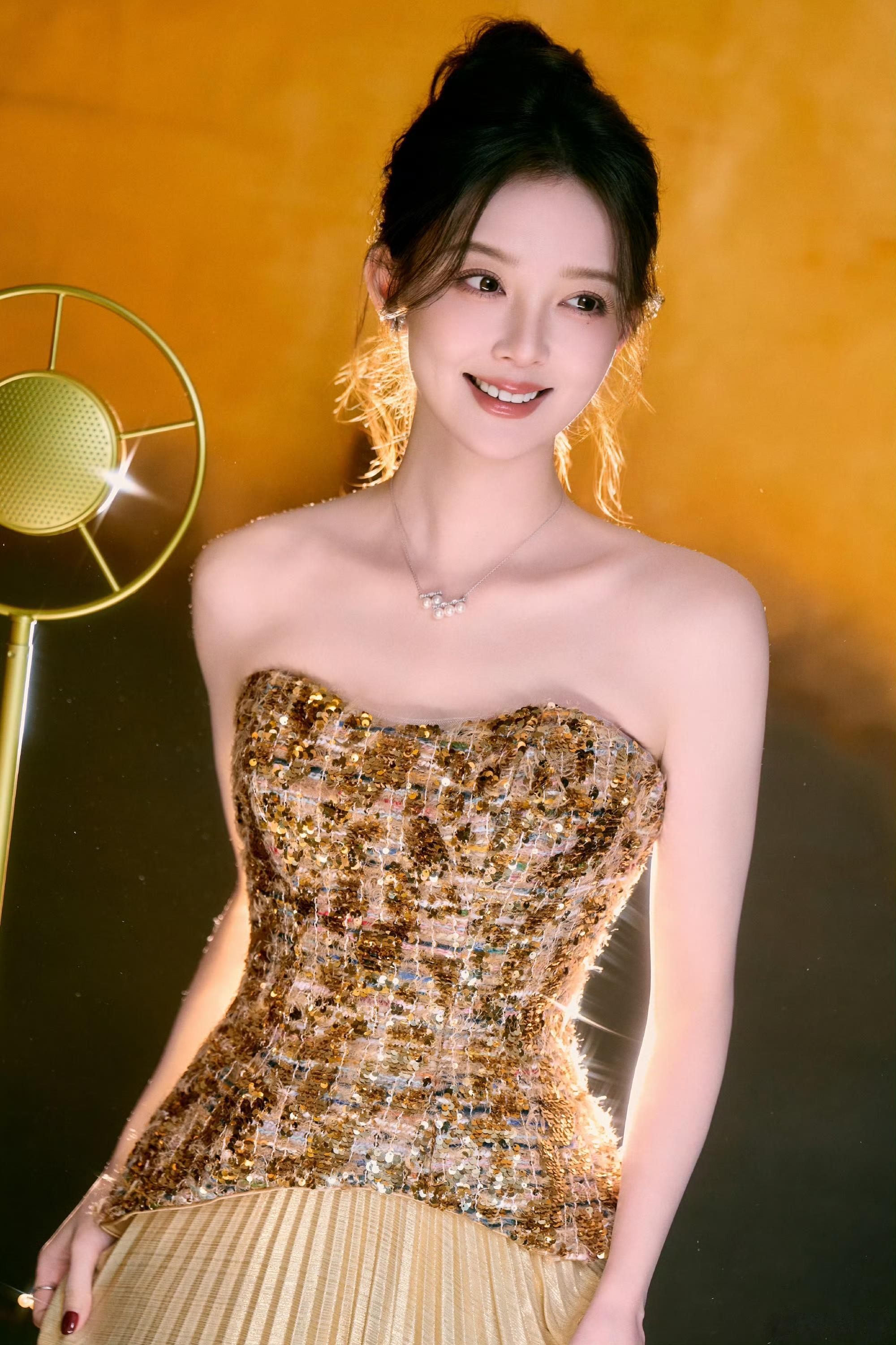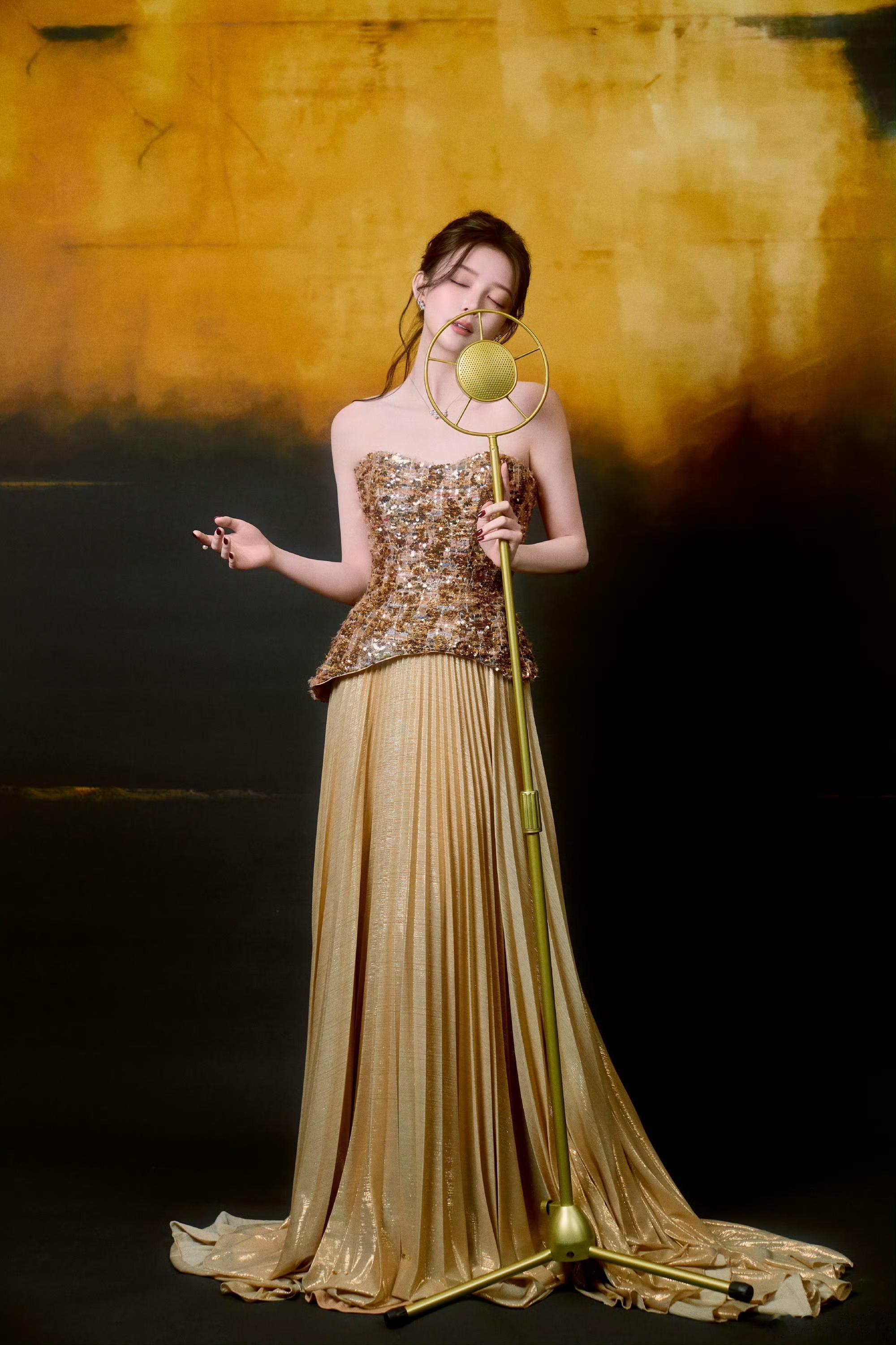 汪小敏鎏金浅黄连衣裙