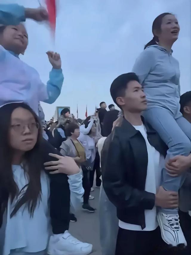 还有一个就是大妹让小妹骑在自己脖子上看升旗,也是感动了网友。