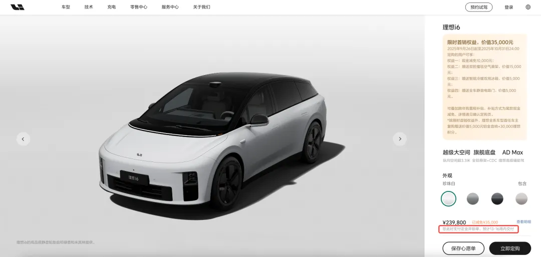 对此,车企官方自然是表示查无此事,毕竟理想i6容不得出一点差错。另外理想官网、小程序等官方购车前台的预计提车周期也没有异样,目前i6在支付定金并锁单后预计能在13-16周内完成交付。