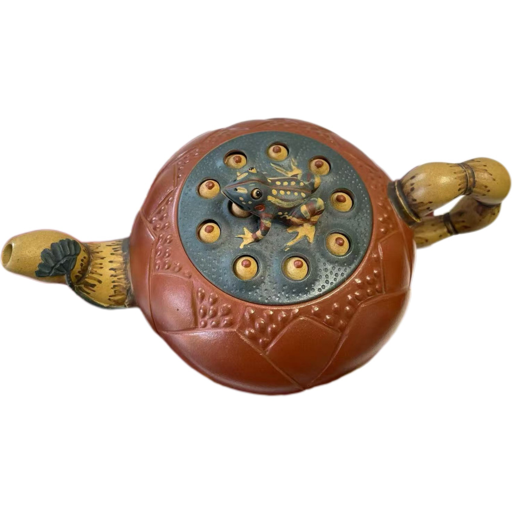 青蛙的造型生动活泼,四肢、眼睛、皮肤纹理等细节都刻画得极为细致,仿佛下一秒就会跳跃起来。壶嘴设计成荷梗的形状,弯曲自然,与壶身的莲子造型相得益彰;壶把则采用竹节的形态,既增加了壶的实用性,又增添了自然的意趣。这种将多种自然元素巧妙融合的造型设计,展现了蒋蓉大师高超的艺术构思与造型能力。