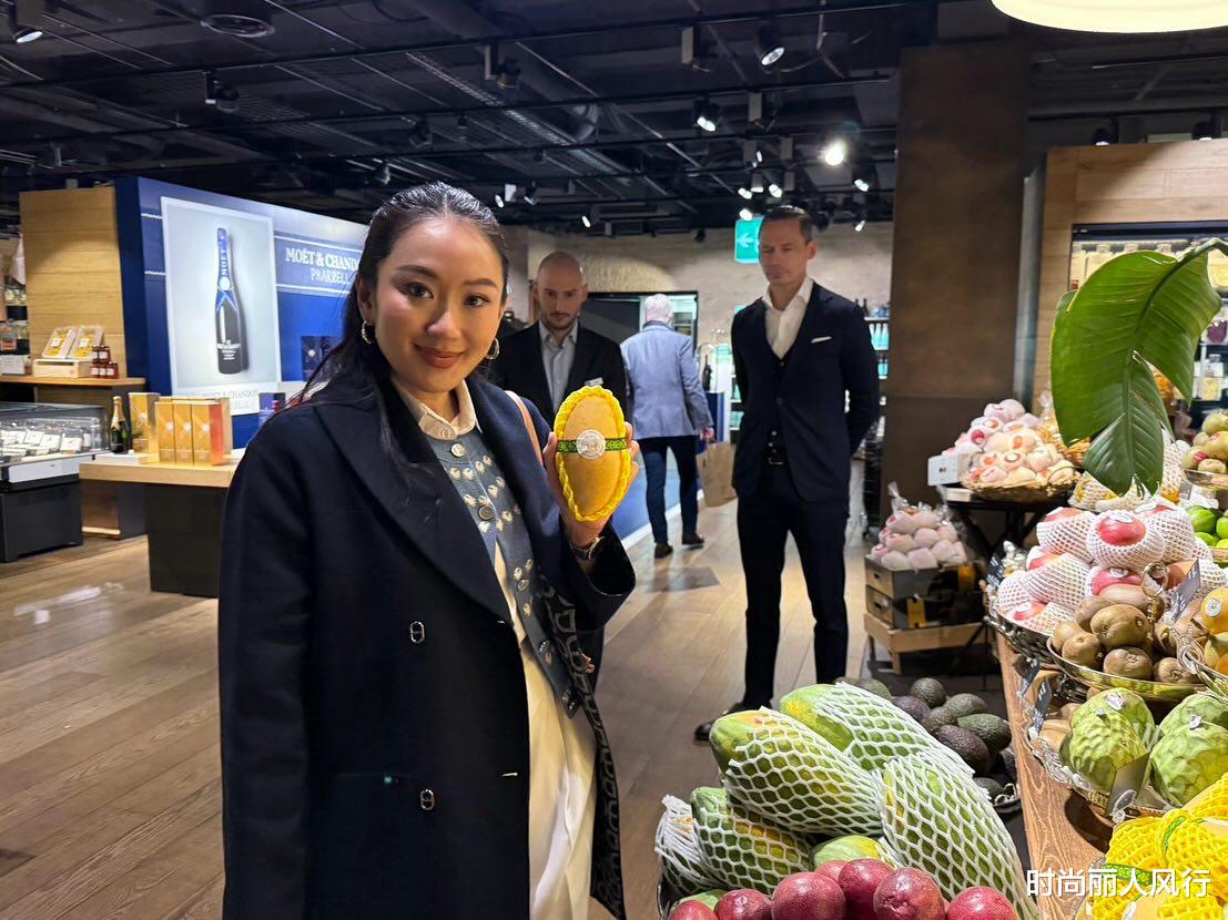 而在瑞士苏黎世的时候,佩通坦换上了一身蓝色的羊绒大衣去逛超市,还真是如同游客一样。拿起货架上的蔬菜水果,佩通坦认真工作的时候真是太有魅力了。
