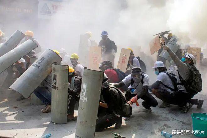 仰光街头充斥着催泪瓦斯和抗议政变的民众。许多人戴着帽子和护目镜,试图跑到安全的地方。