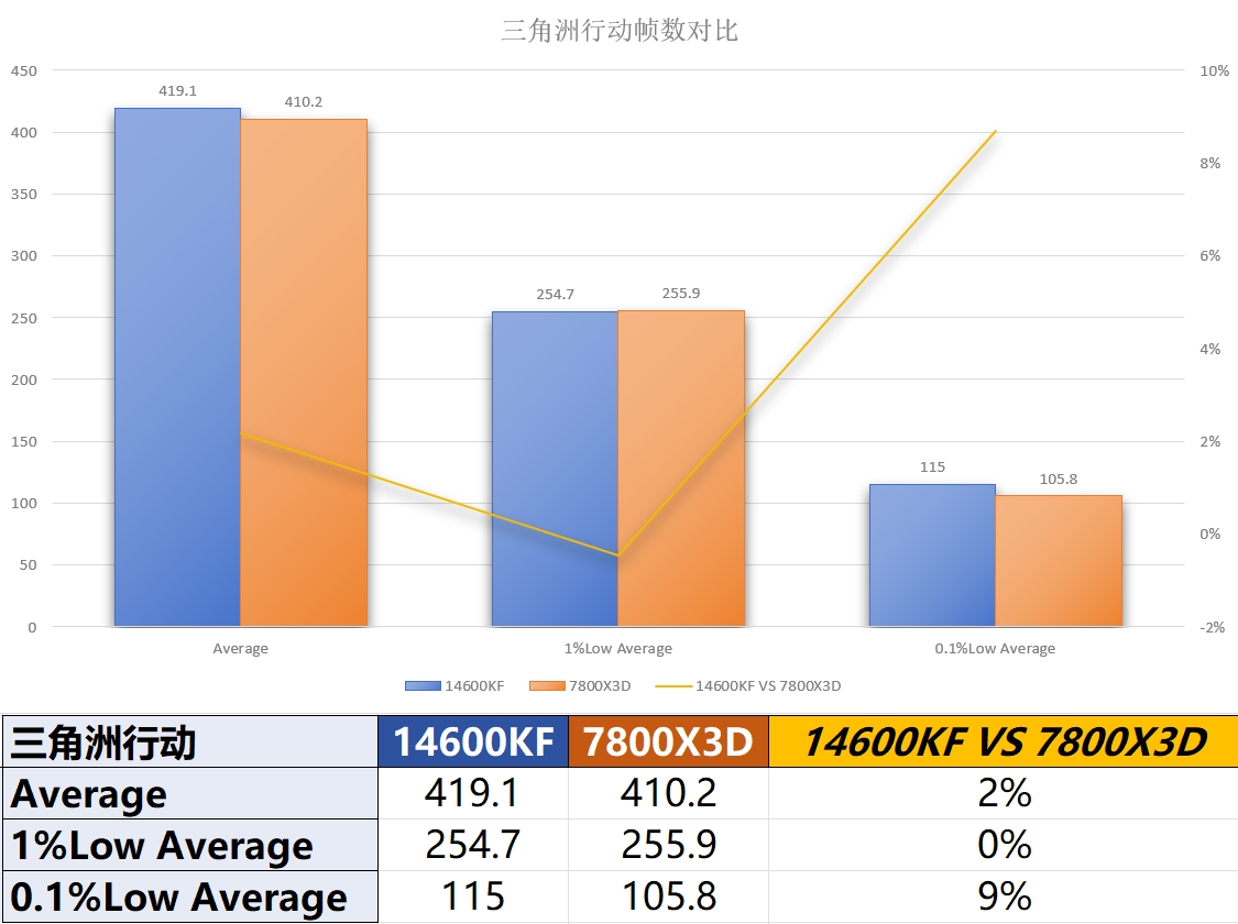 把14600KF这员老将和7800X3D去对比,对于14600KF还是挺不公平的,毕竟14600KF现在售价只有1100元左右,加上B760M的板U套装也不过1600多,但是7800X3D单CPU就已经要2400了,如果再配上主板,售价妥妥是14600KF的两倍,但是经过测试也能看出,在游戏表现上,7800X3D在平均帧率和最高帧率部分虽然有优势,但是在更影响游戏体验的1%Low帧和0.1%Low帧部分14600KF却是有所小胜,加上对于像三角洲行动和黑神话悟空这种超高热度游戏的大作更加友好,如果不想花冤枉钱,14600KF还是很好的选择。
