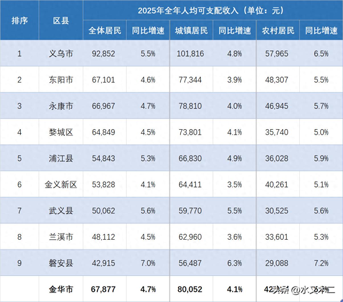 浦江县、金义新区和武义县2025年度人均可支配收入金额也都在五万元之上。其中浦江县和金义新区相对较高,分别达到54843元和53828元;而武义县人均收入则是首次跨过五万元门槛,在五万出头,为50062元,与前面两地还有些距离。三地之中,金义新区增速最低,为4.1%,在全市之中亦是末位;而浦江新和武义县则表现较好,增速分别达到5.3%和5.6%,均在全市平均之上,未来可期!