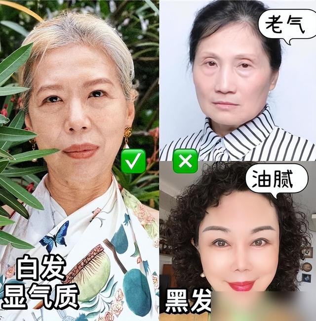 有网友吐槽:“我妈以前每年染三次黑发,结果发根一长出来,黑白分层像戴了帽子,现在她不染了,白发梳顺了烫个大卷,邻居都说‘越老越有气质’!”