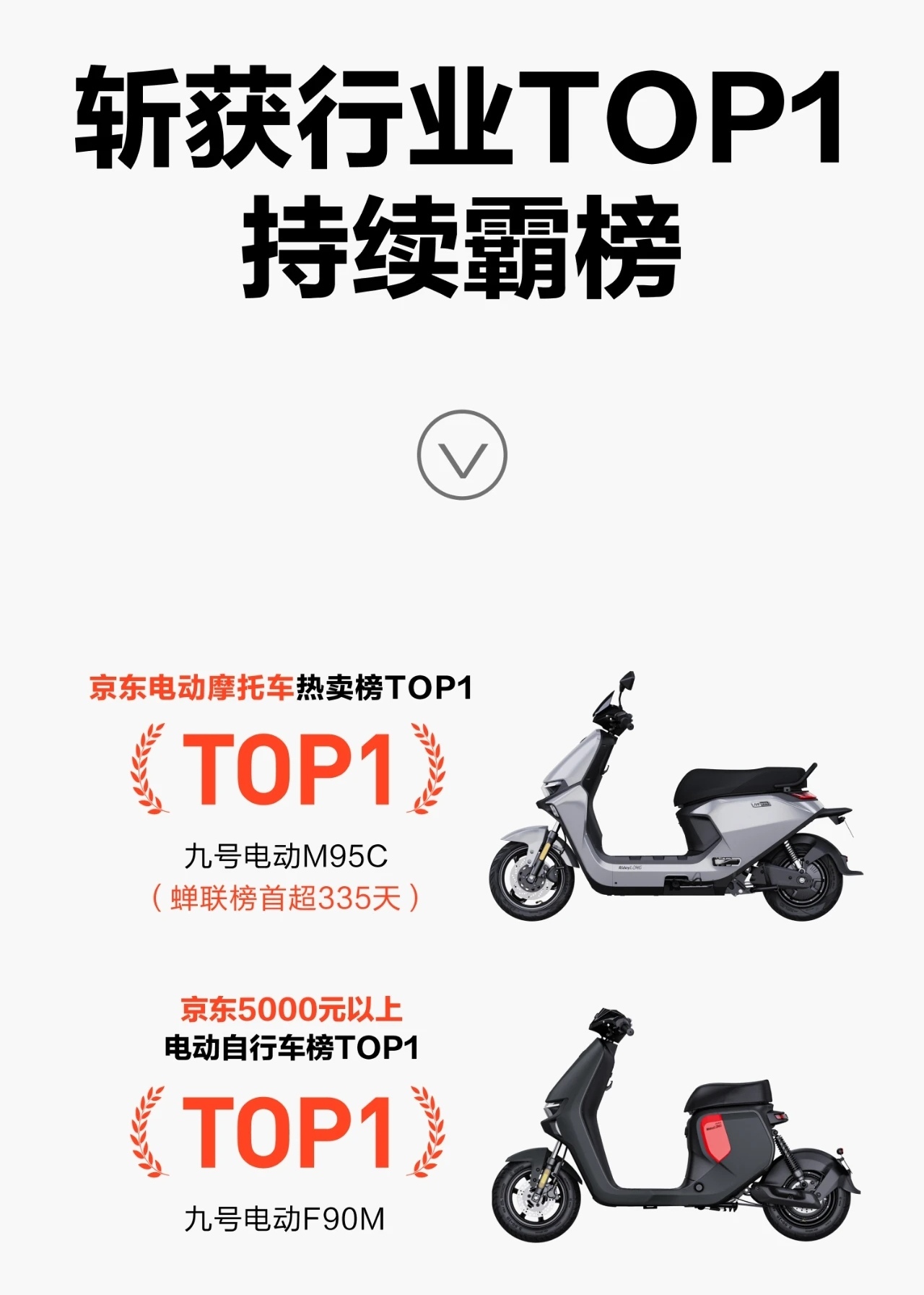 可见九号电动在今年618的表现十分优秀,比如说九号电动M95C持续霸榜京东、天猫、抖音三平台电动摩托车热卖榜TOP 1,主打的是长续航和智能化,内置RideyLONG续航技术,可达到107km的超长续航,加上时尚的外观设计,和九号全方位智能化符合城市通勤需求,受到不少消费者的选购。