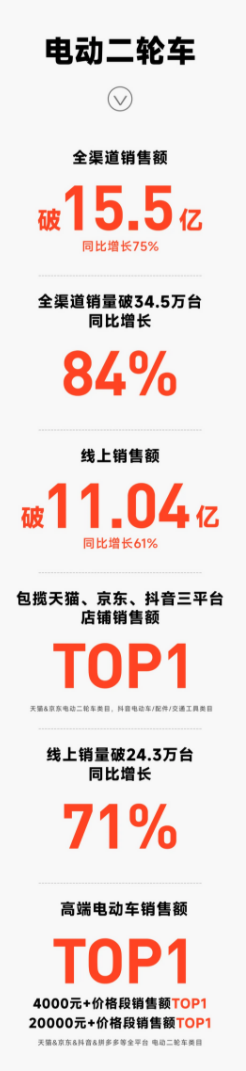 从公布的数据可以看到,从5月20日晚8点至6月20日晚24点,九号公司实现自营全渠道销售额16.3亿元,同比增长67%,当中线上销售额超11.5亿元,同比增长55%。其中九号电动作为公司增速最快的业务,贡献销售收入15.5亿元,同比增长75%,且持续领跑4000元以上价位高端电动车销售额榜首。