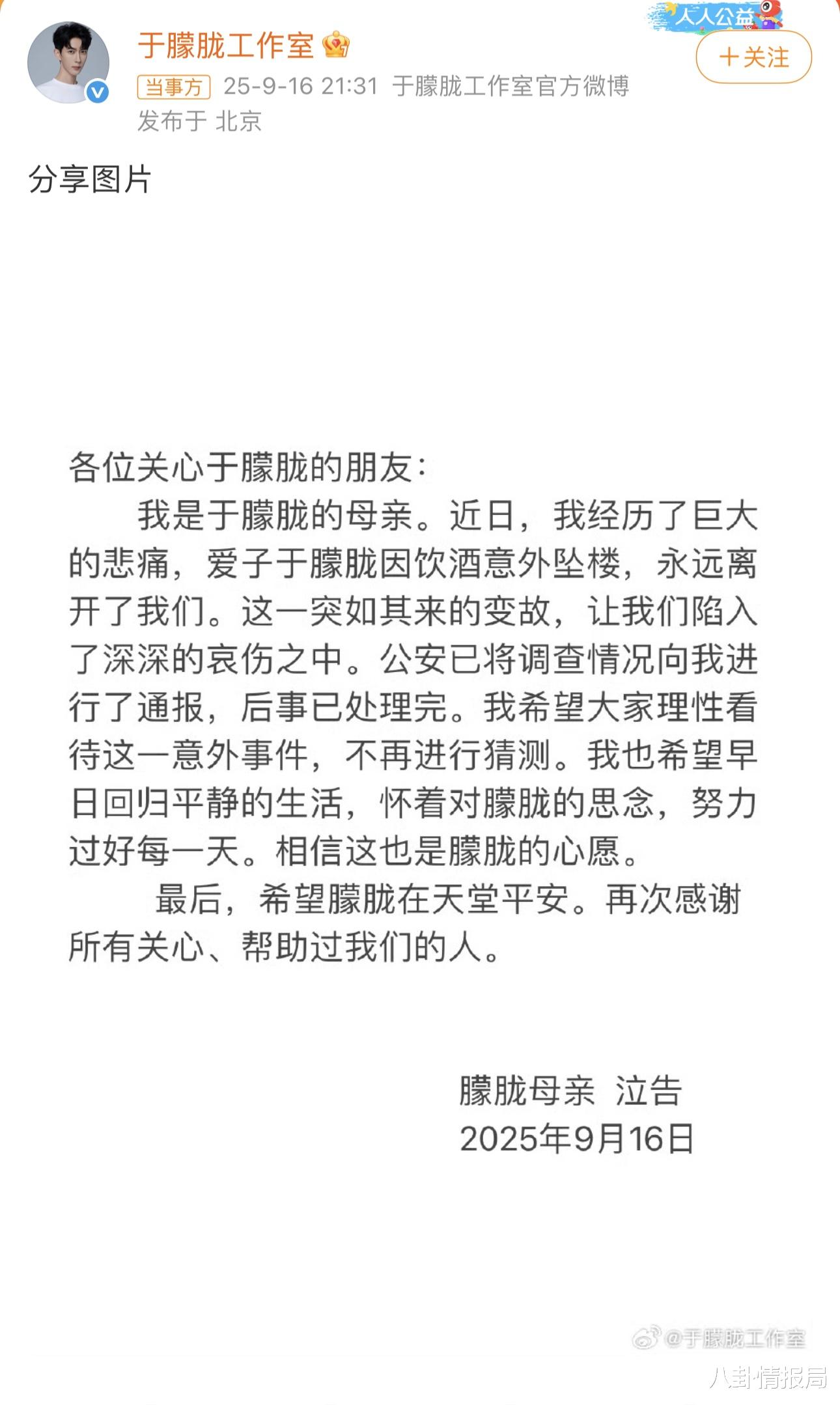 不过别慌!就在大家脑洞大开,已经开始写“娱乐圈未解之谜”小作文的时候,于朦胧工作室终于发话了:不是黑幕!不是复仇剧!也不是拍《极限挑战》忘了喊“我是于朦胧”!真相是——他因为饮酒,意外坠楼了。