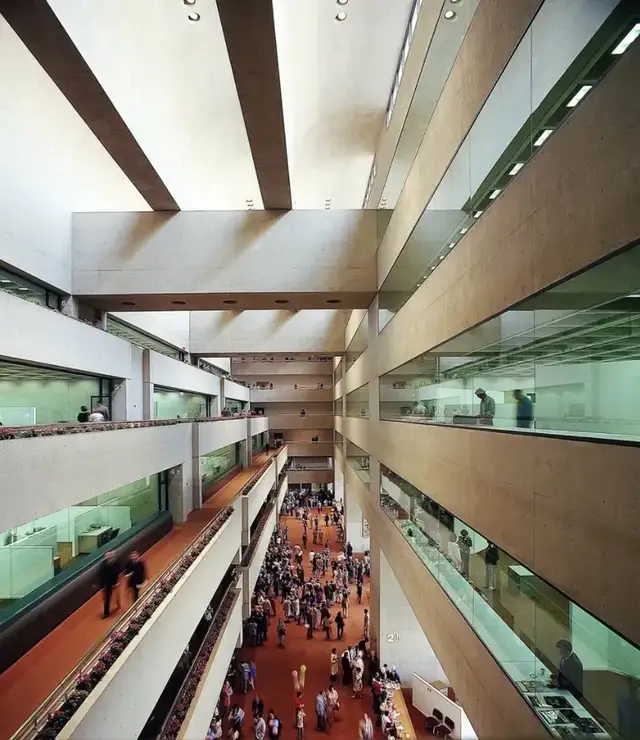 贝聿铭采用极具雕塑感的倒金字塔造型,北立面以34度角向前倾斜,最大挑出距离达20.7米。作为美国粗野主义建筑的标志性案例,它长期承载着市政功能,更是城市复兴的重要象征。