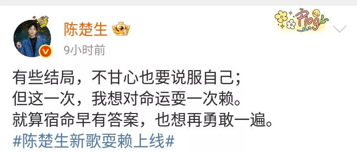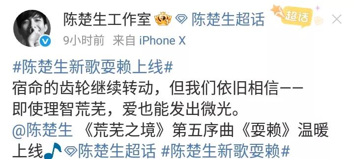 陈楚生工作室在社交平台发文:陈楚生《荒芜之境》第五序曲《耍赖》温暖上线!