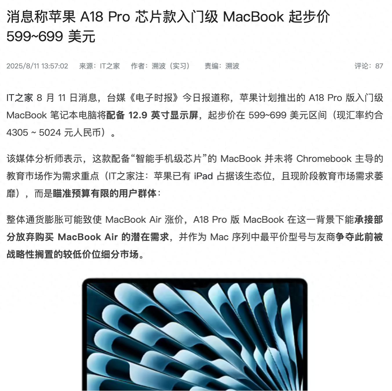 库老板真的“杀疯了”,外媒爆料苹果或在2025年底到2026年初推出搭载A18 Pro芯片的MacBook Air,售价约4K-5K,主打教育市场。这是不给Win本留活路啊?对于想用Mac的同学来说无疑狂喜。