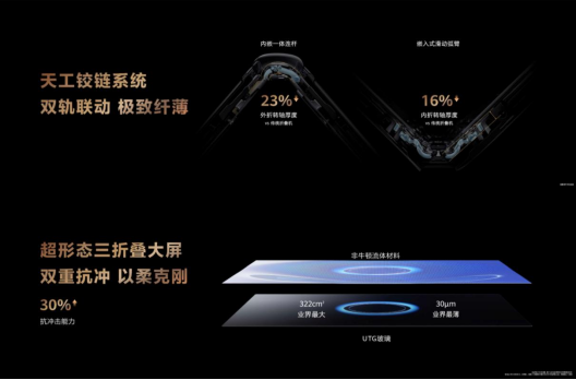 三折叠技术的突破,铰链是核心关键点。华为Mate XTs 非凡大师采用天工铰链,通过一体连杆结构以及嵌入式滑轨结构带来了更薄的机身,展开态机身最薄处仅有3.6mm。与此同时,航天级特种钢材料、业界最大最薄UTG玻璃等新材料的加入,给华为Mate XTs 非凡大师带来了更强的可靠性,日常使用可以更加安心。
