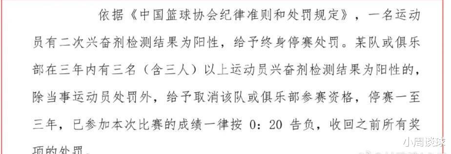 根据CBA的新规定,如果球员在2次兴奋剂检测中呈现阳性,将会被终身禁赛。对于球队(俱乐部),在3年内有3名及以上运动员兴奋剂检测为阳性,则取消该球队(俱乐部)的参赛资格,禁赛期为1-3年,已经参加的比赛全部按照0-20判负,并且收回之前所有的奖项。这样的处罚看起来是非常严重的,显示了CBA总公司和中国篮协反对兴奋剂的决心,也打击了某些球队的违规手段和行为。